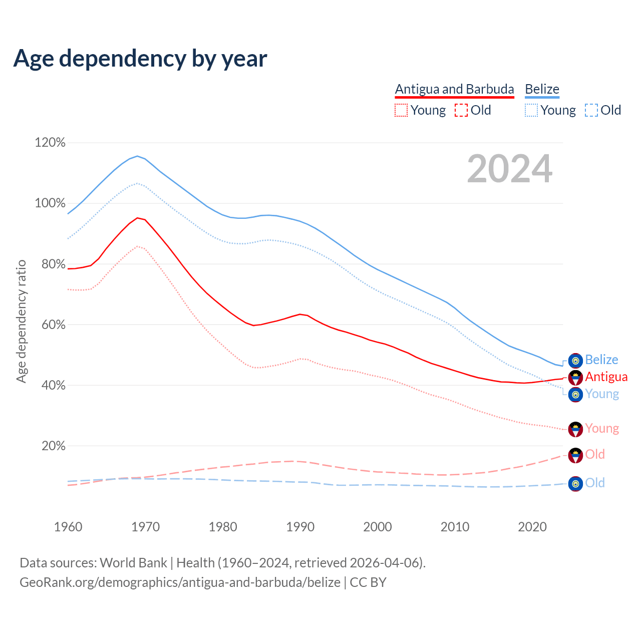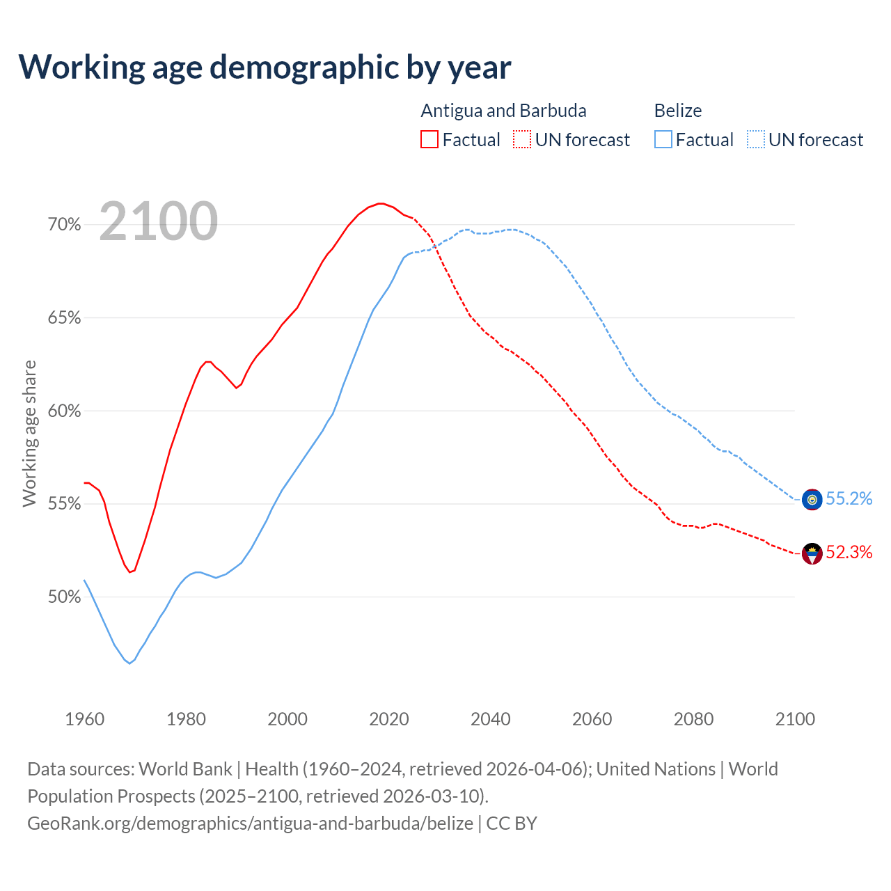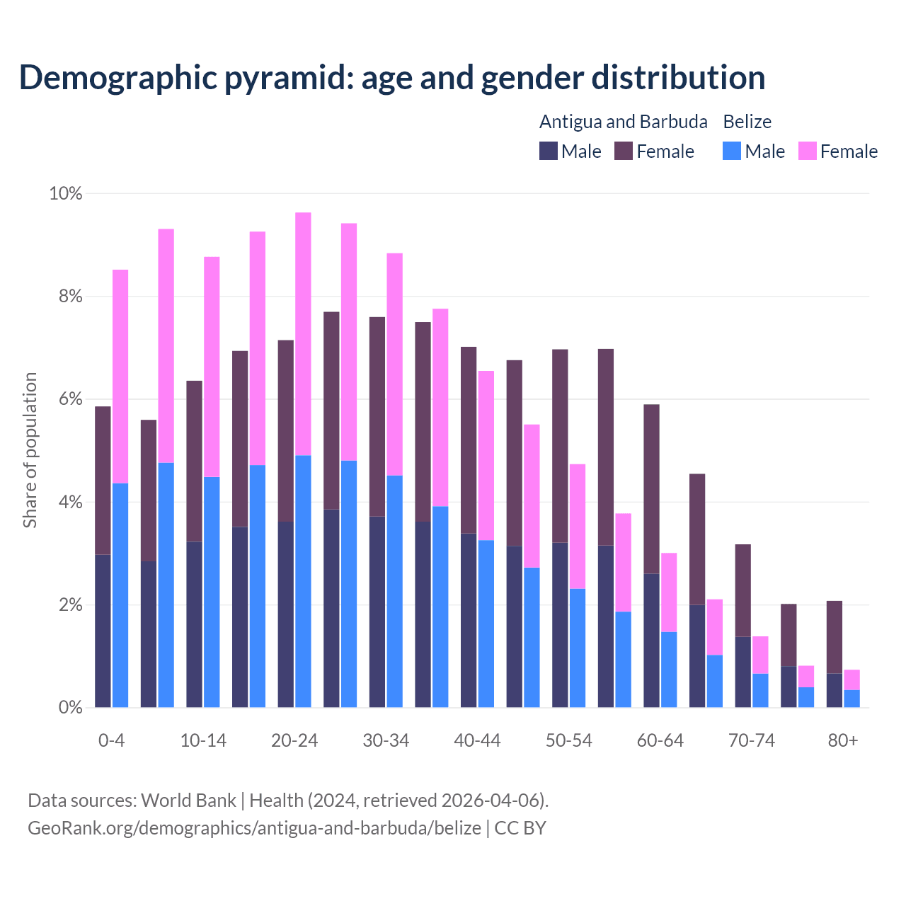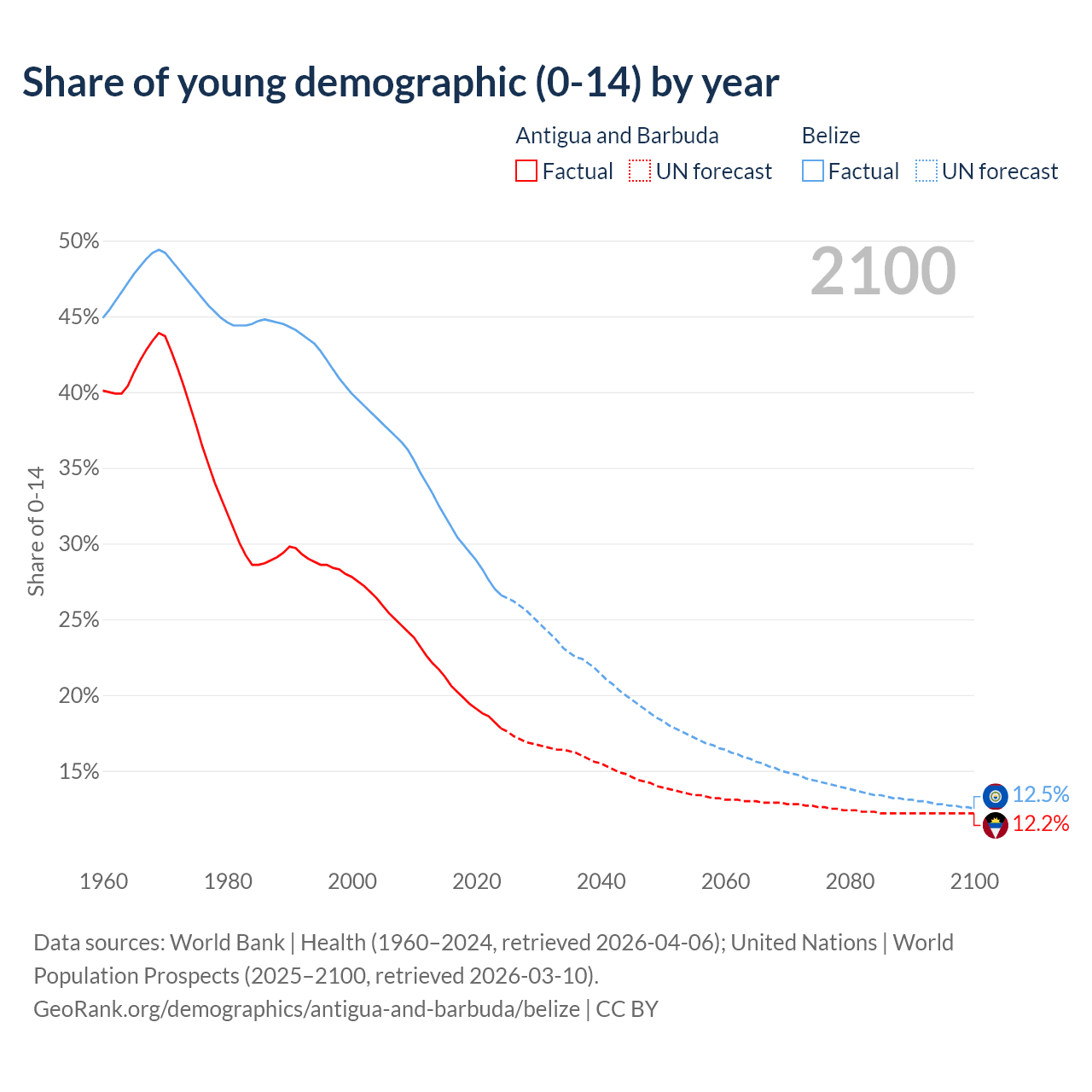 - The share of young demographic (0-15 years old) in Antigua and Barbuda is 17.8% vs 26.6% in Belize.