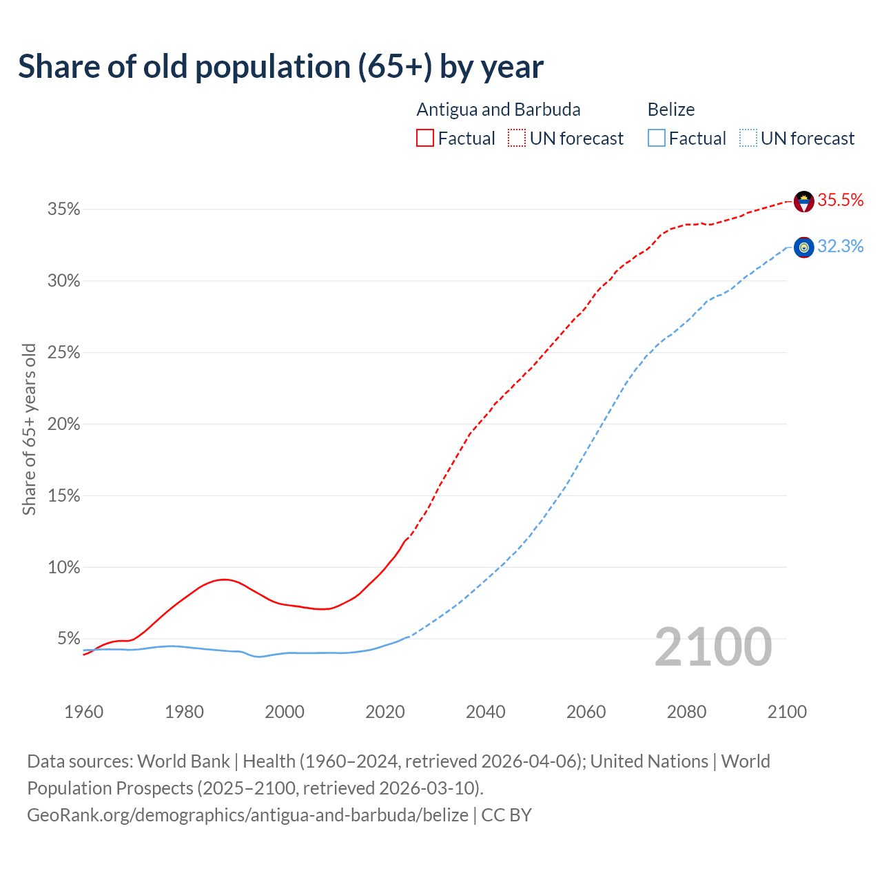 The share of older people aged 65 and over is 11.8% in Antigua and Barbuda and 5.02% in Belize. Life expectancy in Antigua and Barbuda compared to Belize .