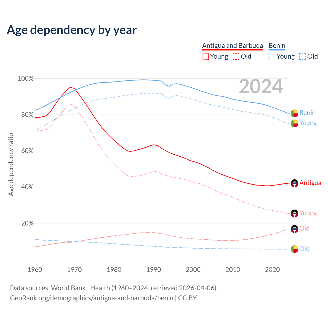 - Antigua and Barbuda is ranked 67/196 by median age (oldest to youngest) vs 179/196 for Benin.