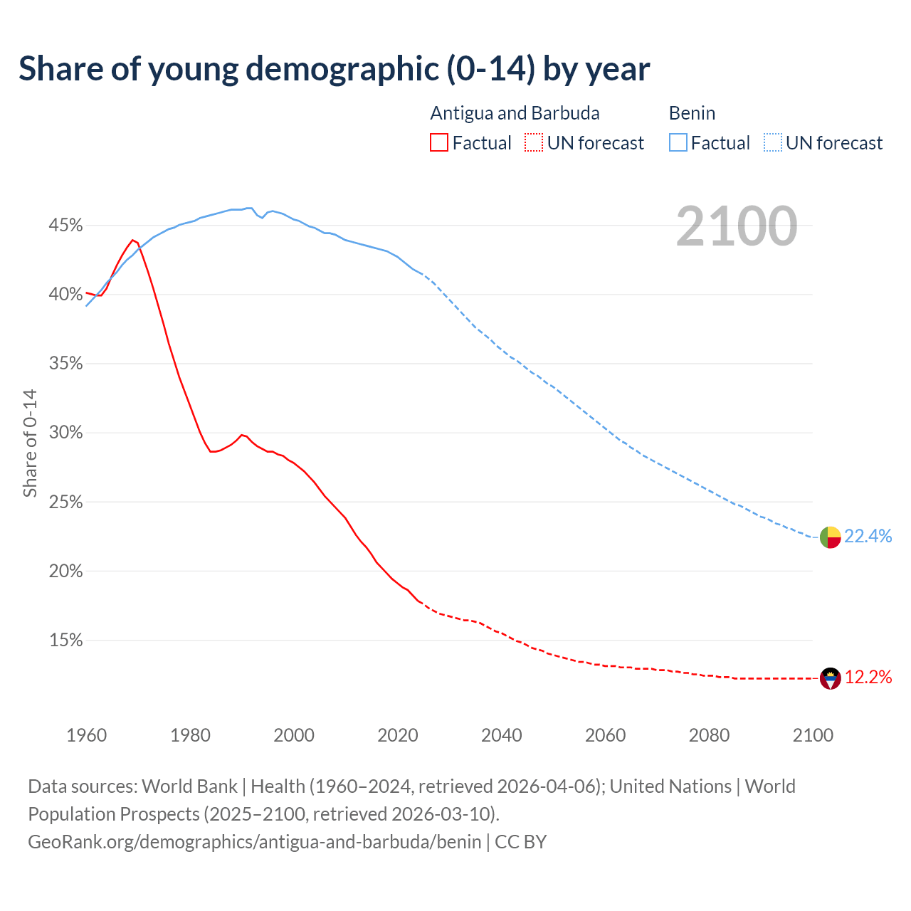 - The share of young demographic (0-15 years old) in Antigua and Barbuda is 17.8% vs 41.6% in Benin.