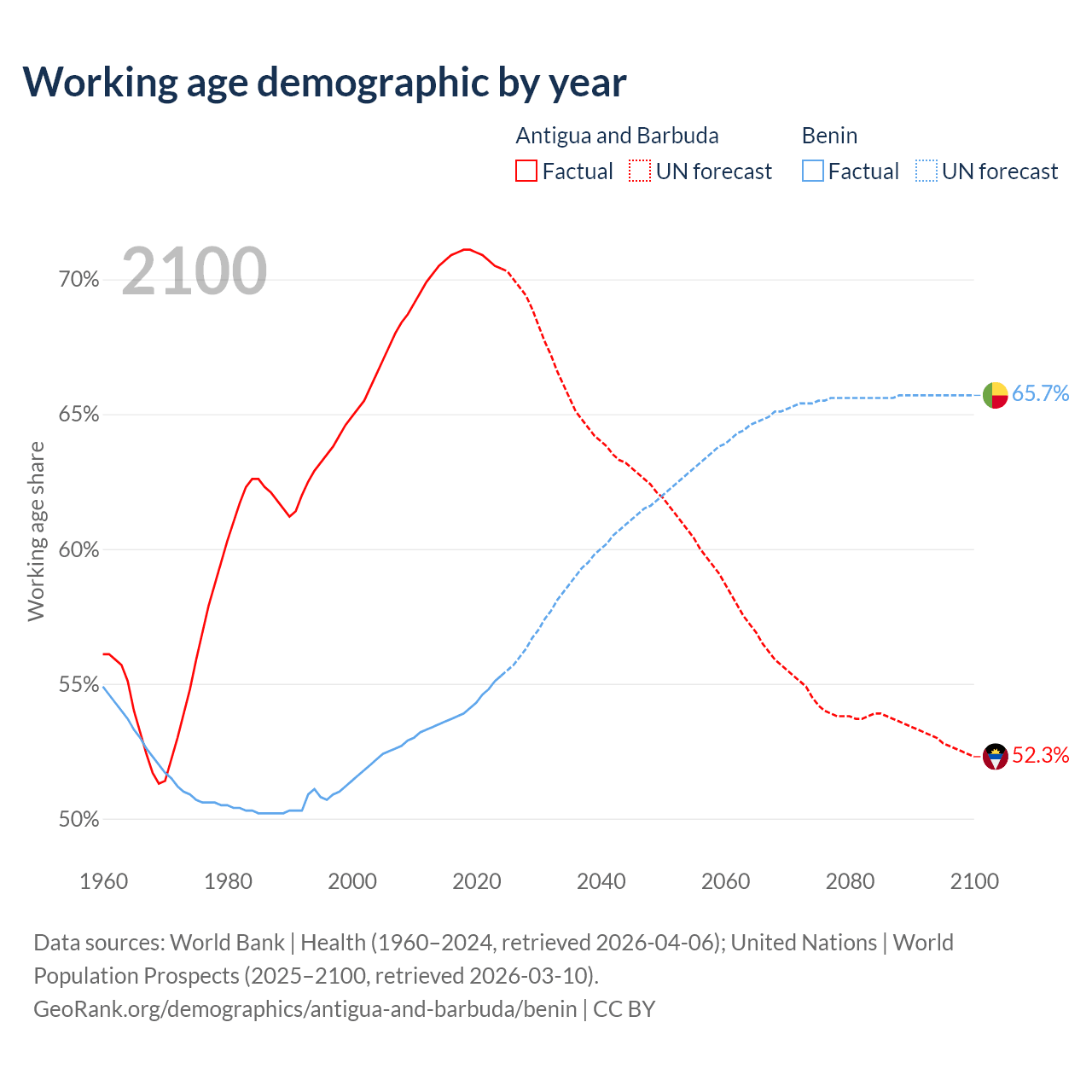 - Antigua and Barbuda has 66.7K working age adults (aged 15-64) vs 8.45M in Benin.