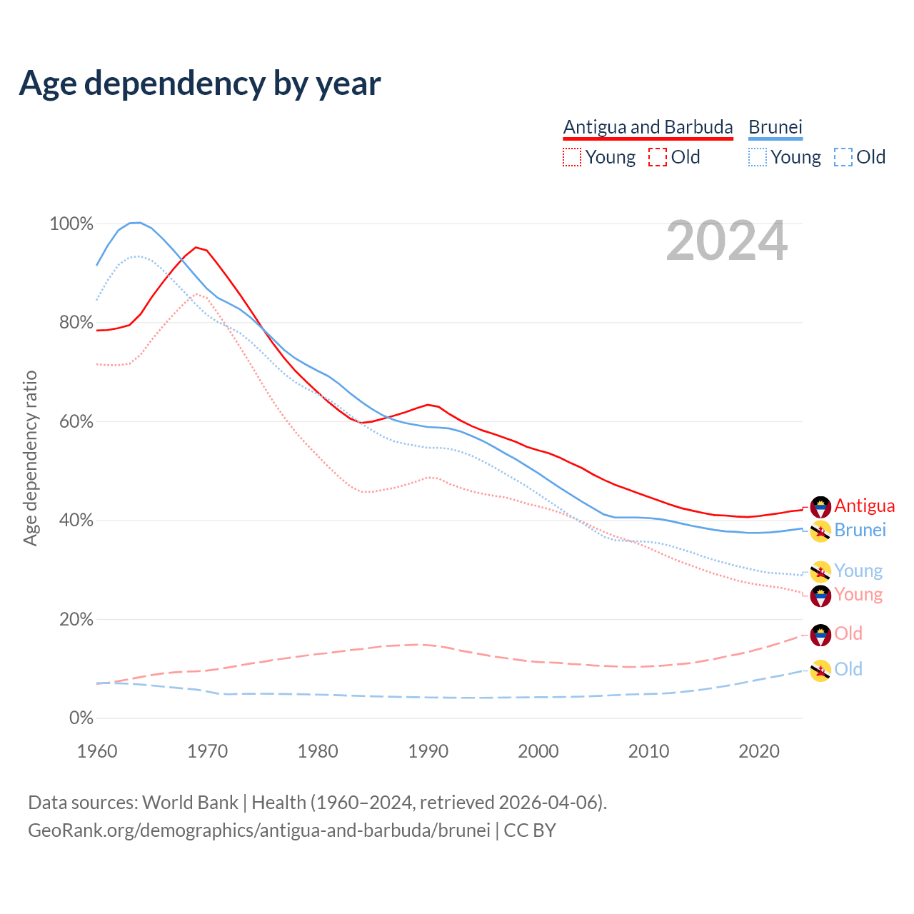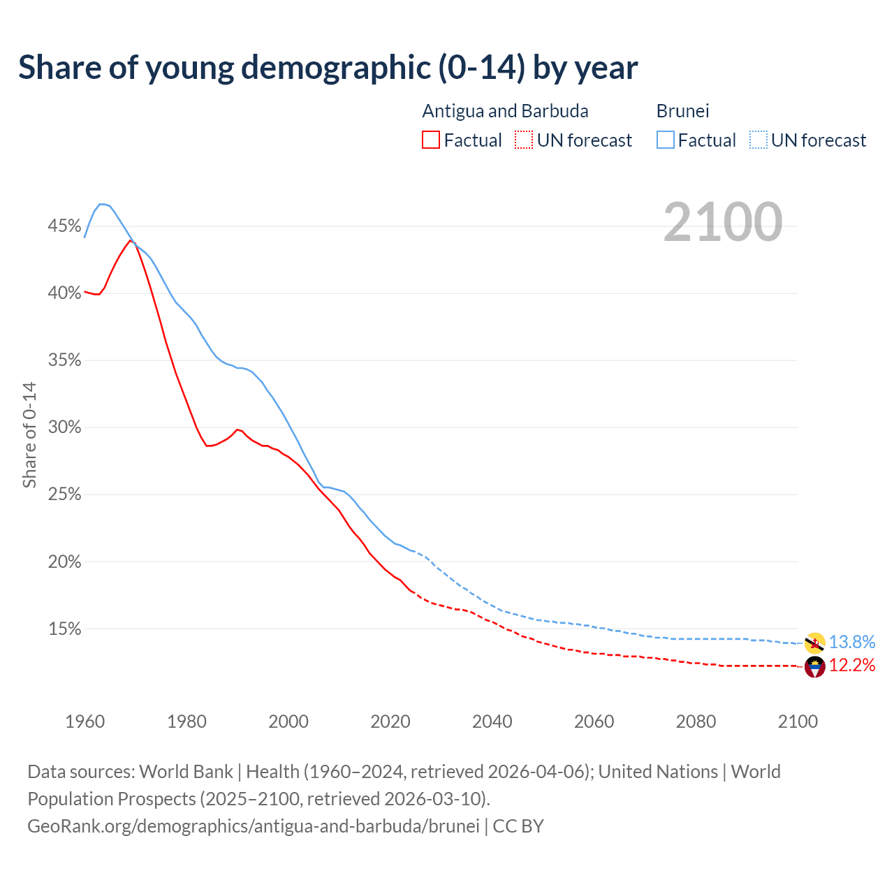 - The share of young demographic (0-15 years old) in Antigua and Barbuda is 17.8% vs 20.8% in Brunei.