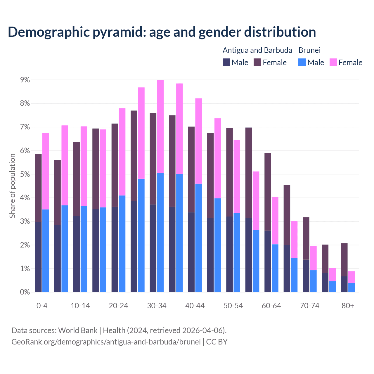 - The median age in Antigua and Barbuda is 36.9 years compared to 33.2 years in Brunei.