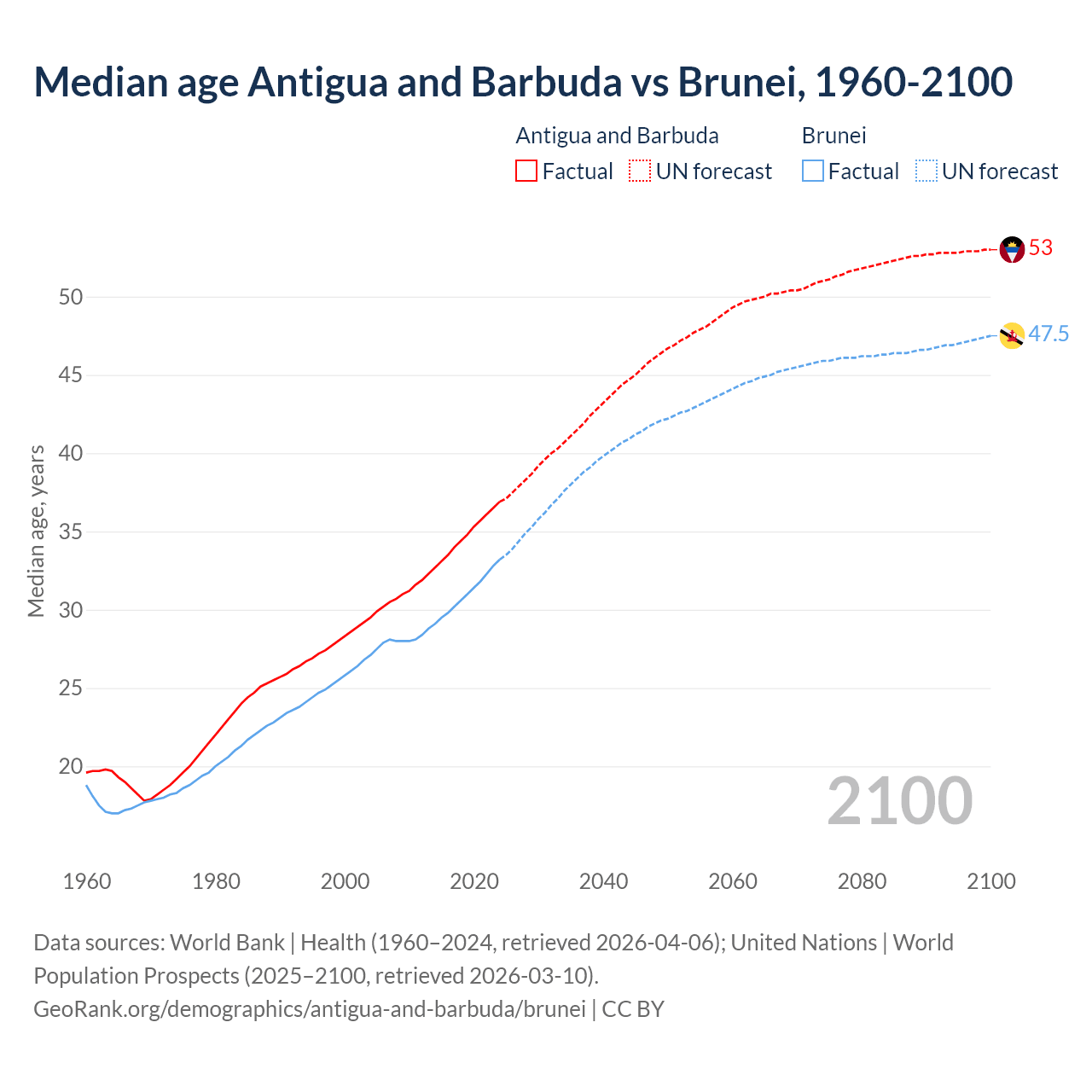 - Antigua and Barbuda is ranked 67/196 by median age (oldest to youngest) vs 88/196 for Brunei.