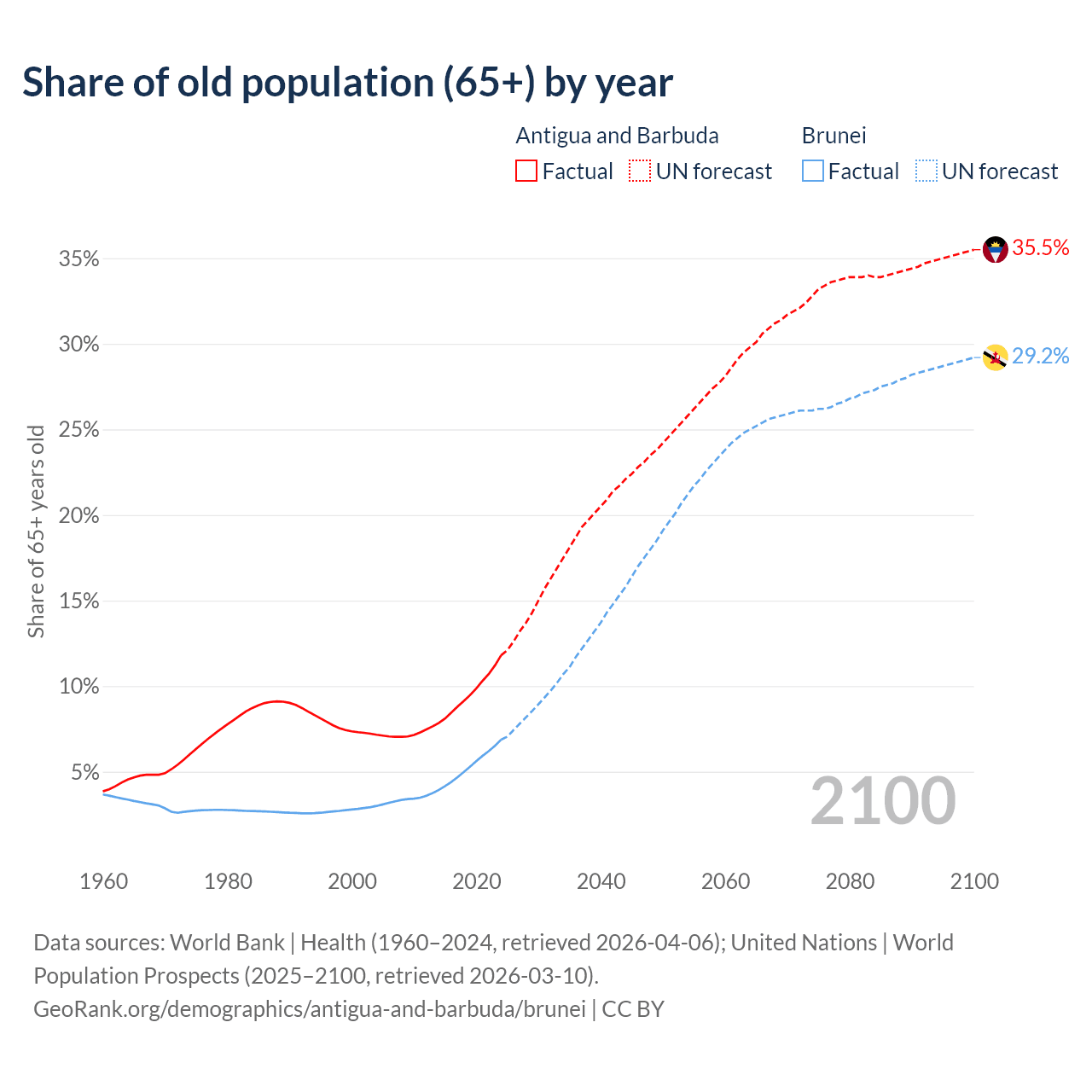 - The share of old-age demographic (65+) in Antigua and Barbuda is 11.8% vs 6.87% in Brunei.