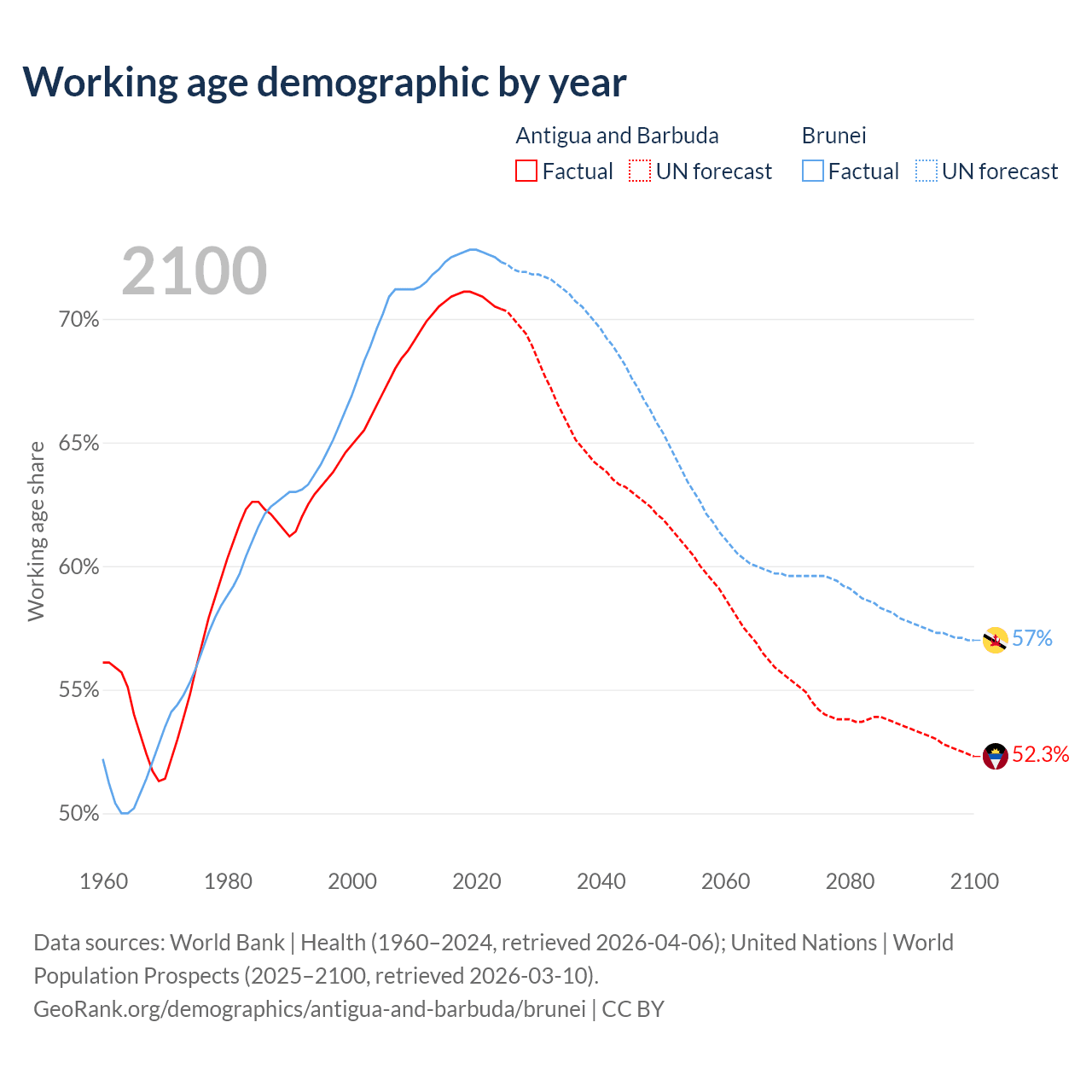 - Antigua and Barbuda has 66.7K working age adults (aged 15-64) vs 340K in Brunei.