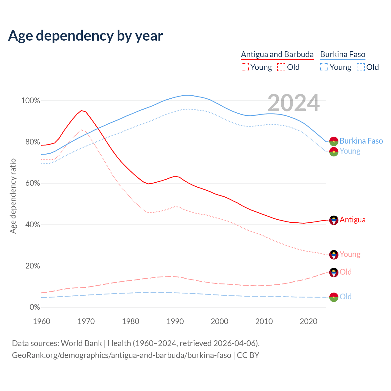 The share of older people aged 65 and over is 11.8% in Antigua and Barbuda and 2.65% in Burkina Faso. Life expectancy in Antigua and Barbuda compared to Burkina Faso .