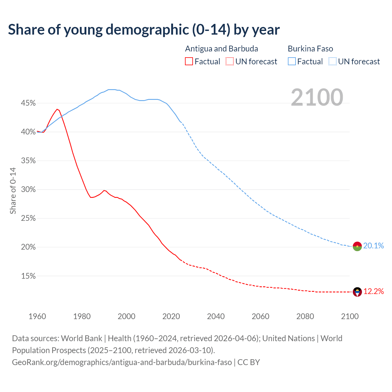 - The share of young demographic (0-15 years old) in Antigua and Barbuda is 17.8% vs 41.8% in Burkina Faso.