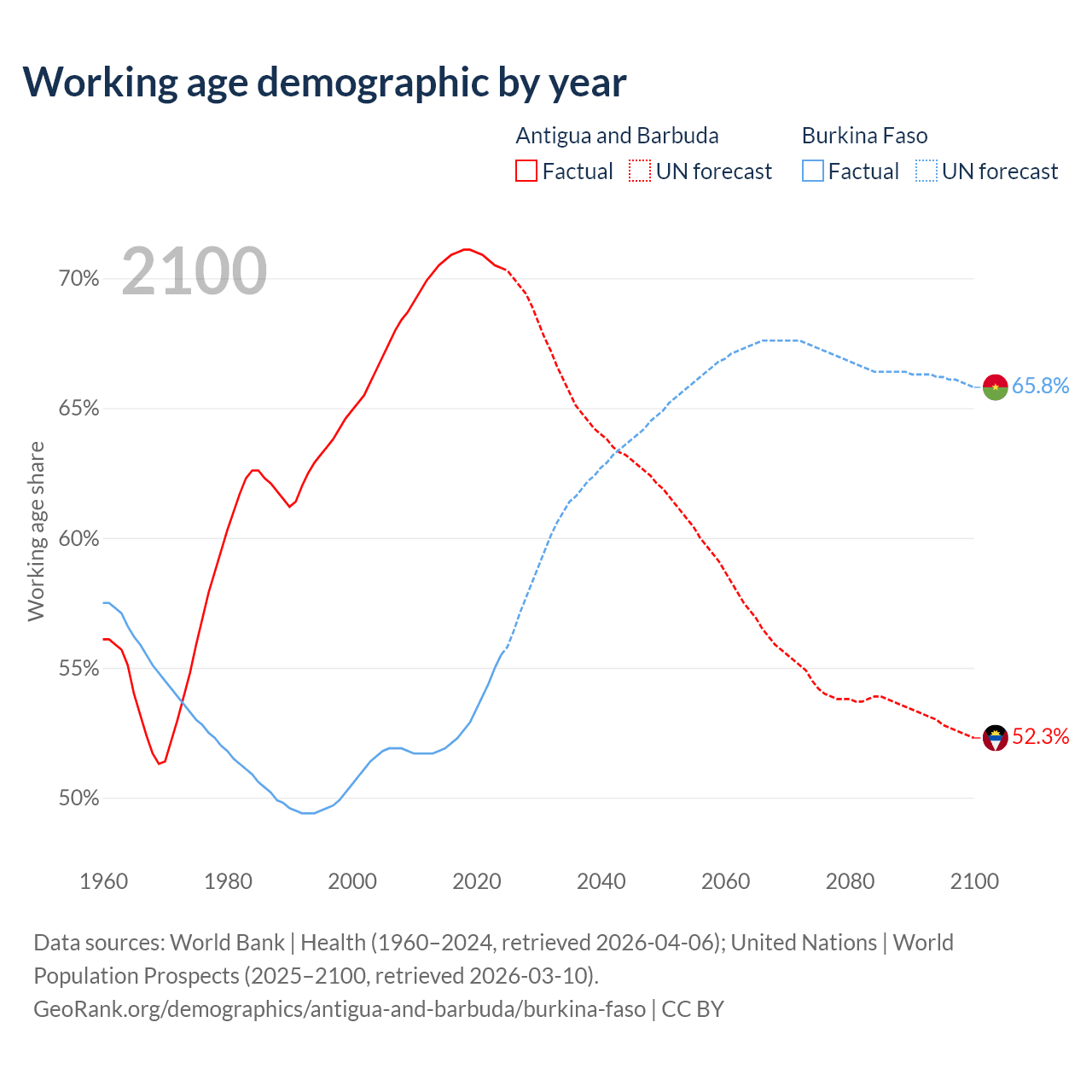 - Antigua and Barbuda has 66.7K working age adults (aged 15-64) vs 13.8M in Burkina Faso.