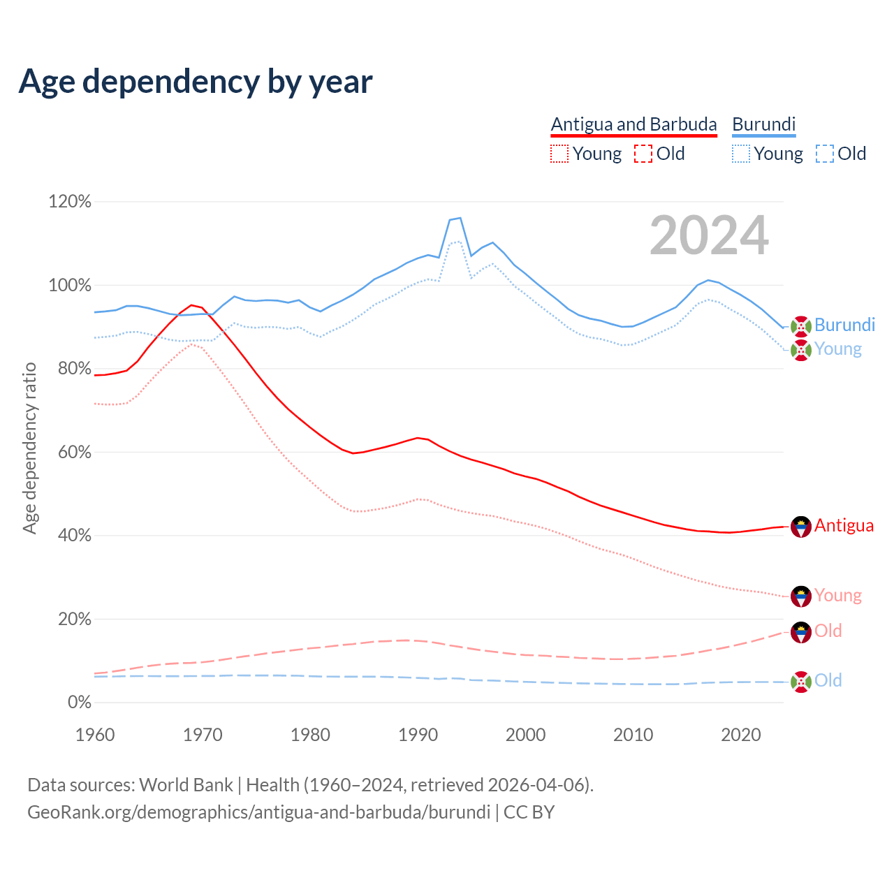 - Antigua and Barbuda is ranked 67/196 by median age (oldest to youngest) vs 190/196 for Burundi.