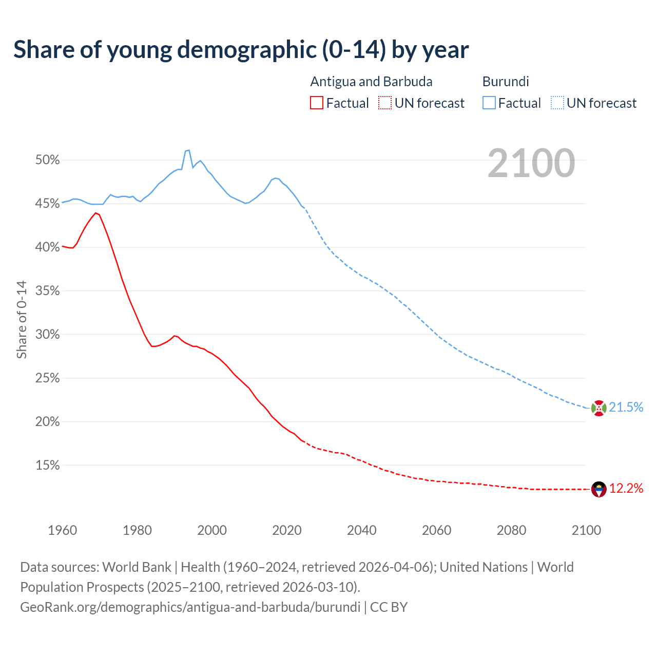 - The share of young demographic (0-15 years old) in Antigua and Barbuda is 17.8% vs 44.7% in Burundi.