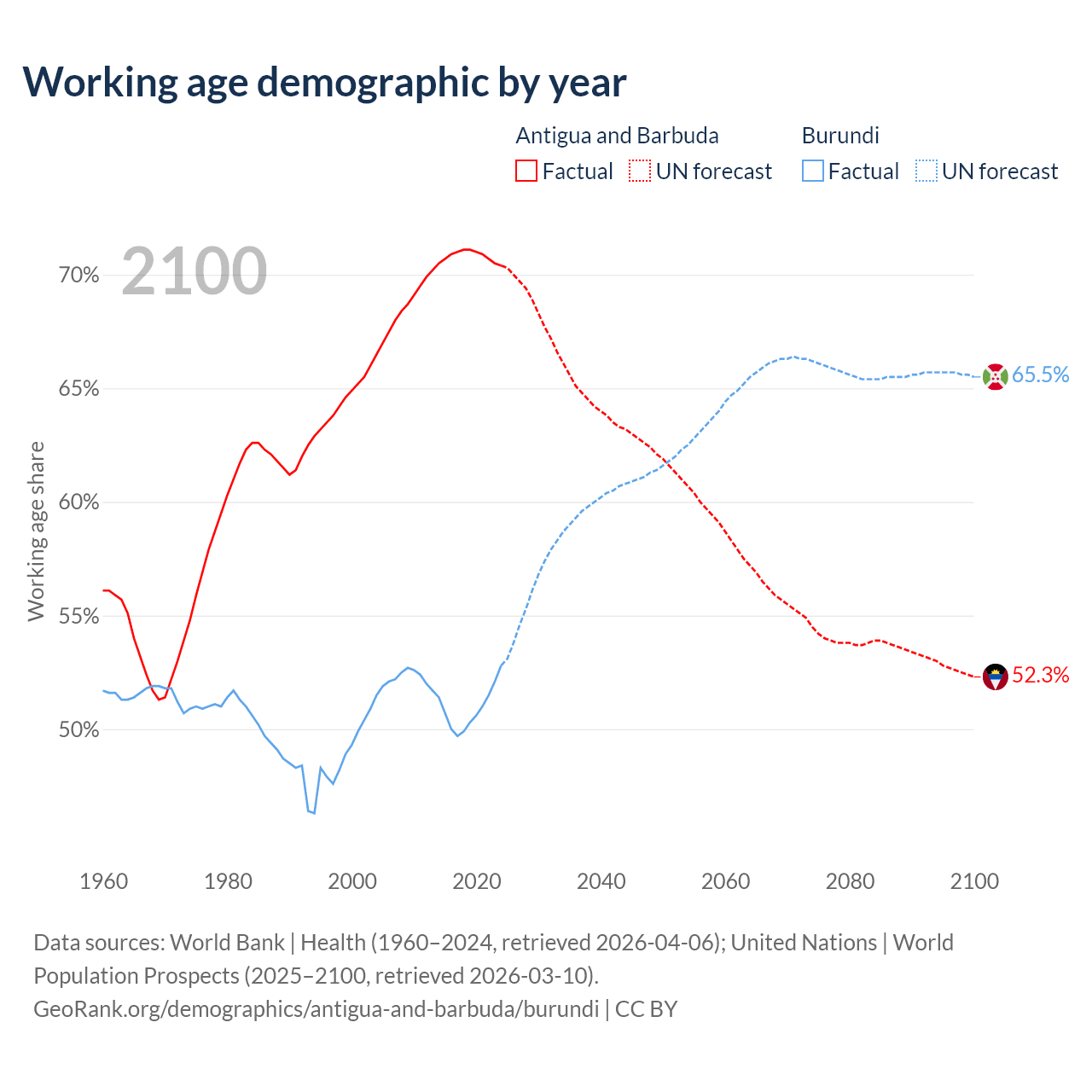 - Antigua and Barbuda has 66.7K working age adults (aged 15-64) vs 7.83M in Burundi.