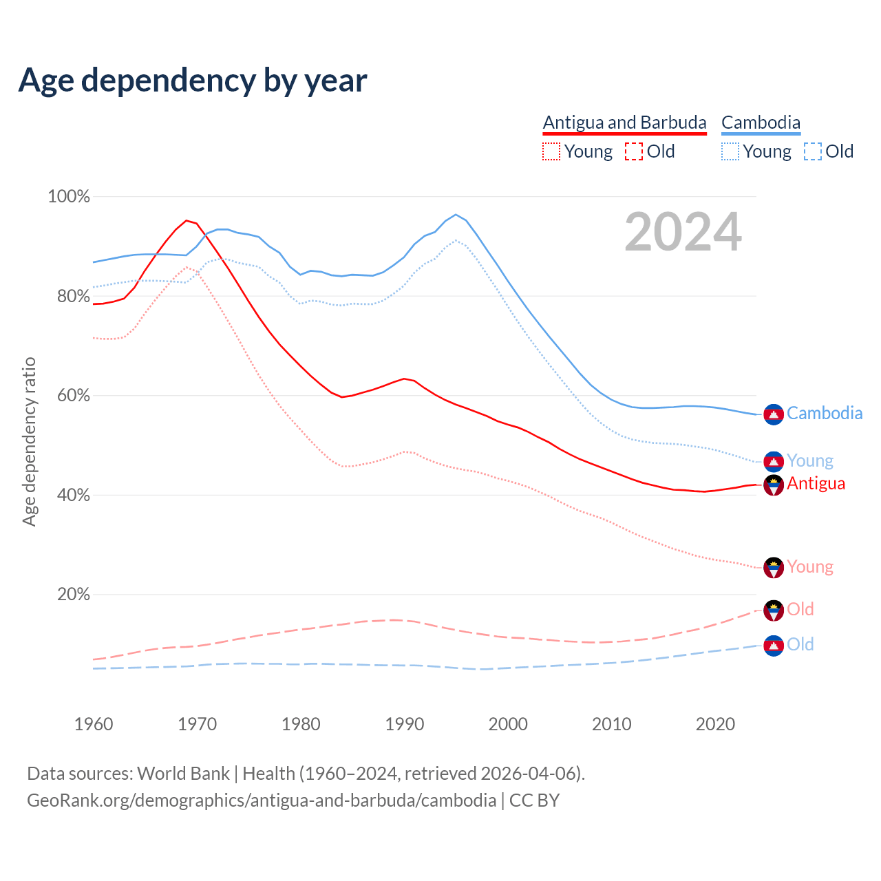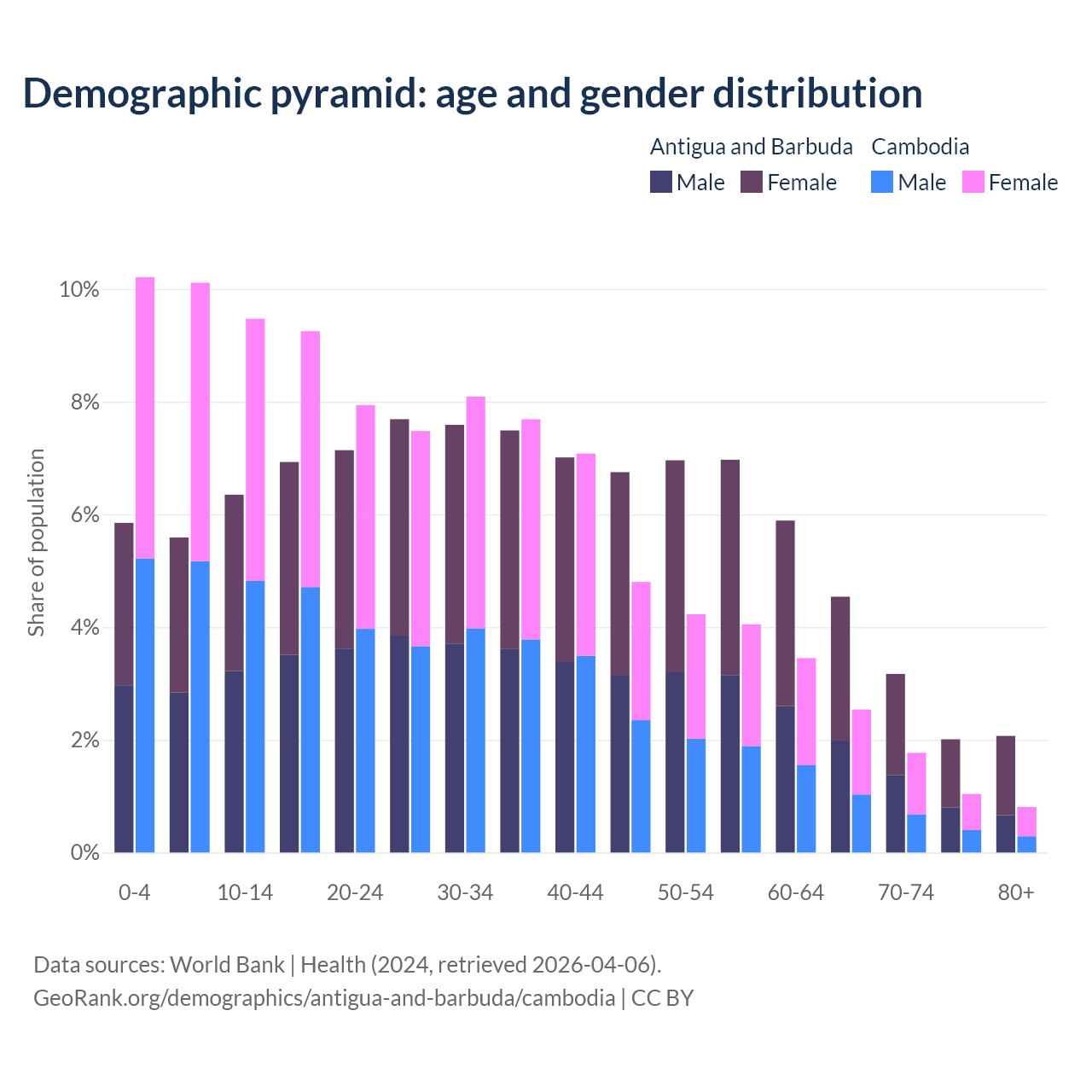 - Antigua and Barbuda is ranked 67/196 by median age (oldest to youngest) vs 121/196 for Cambodia.