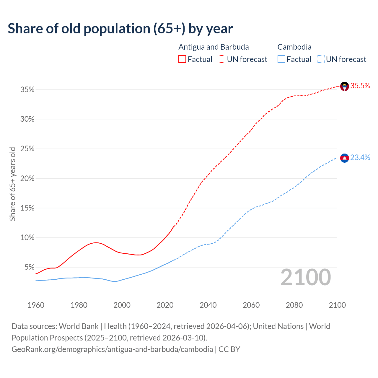 The share of older people aged 65 and over is 11.8% in Antigua and Barbuda and 6.16% in Cambodia. Life expectancy in Antigua and Barbuda compared to Cambodia .