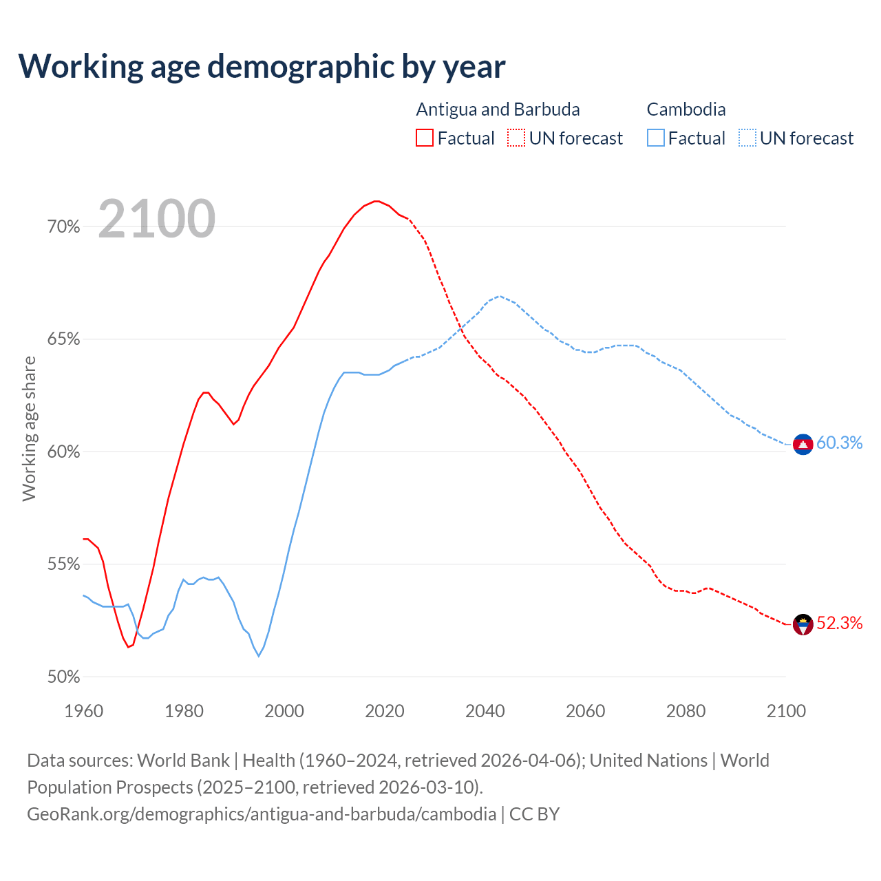 - Antigua and Barbuda has 66.7K working age adults (aged 15-64) vs 11.6M in Cambodia.