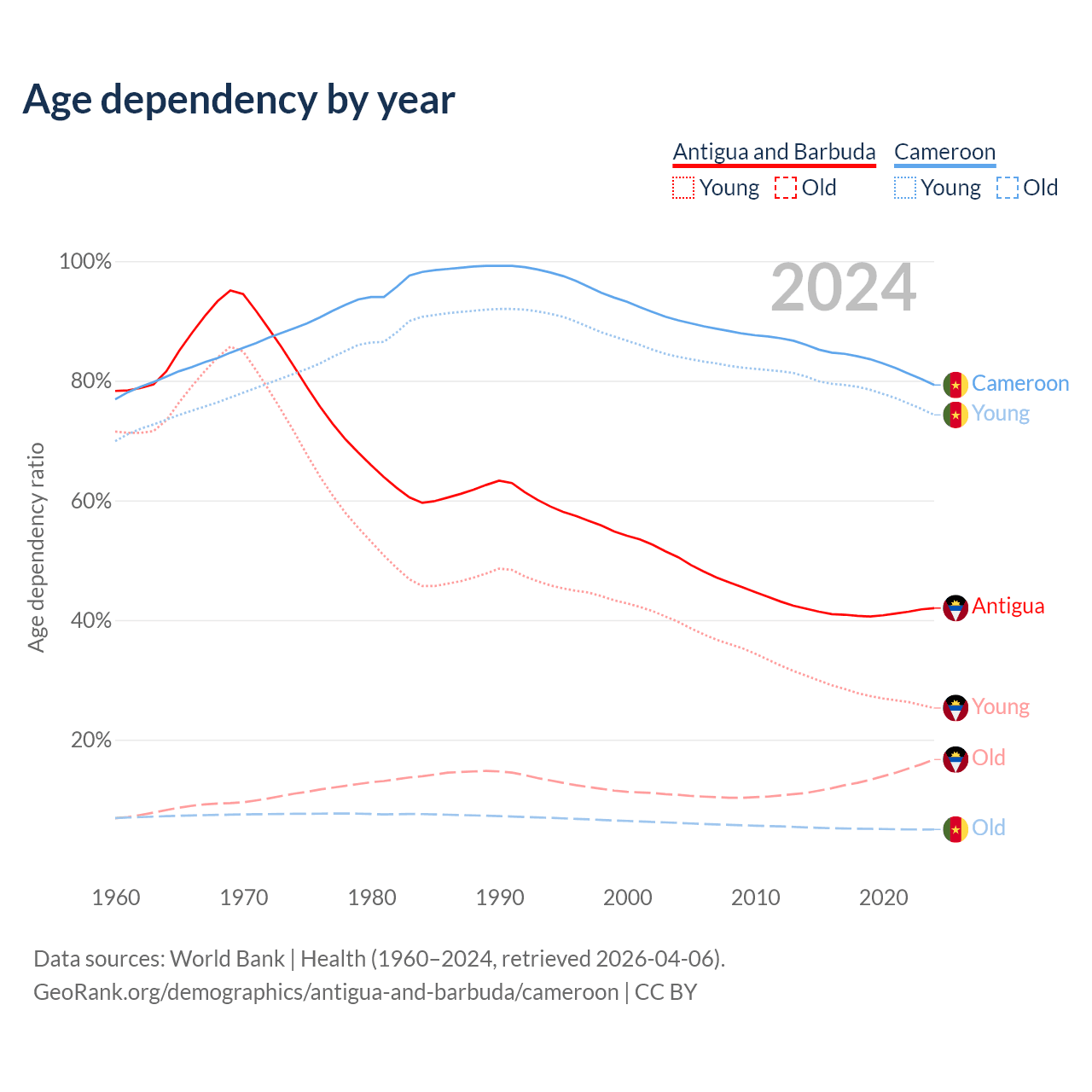 - The share of young demographic (0-15 years old) in Antigua and Barbuda is 17.8% vs 41.4% in Cameroon.