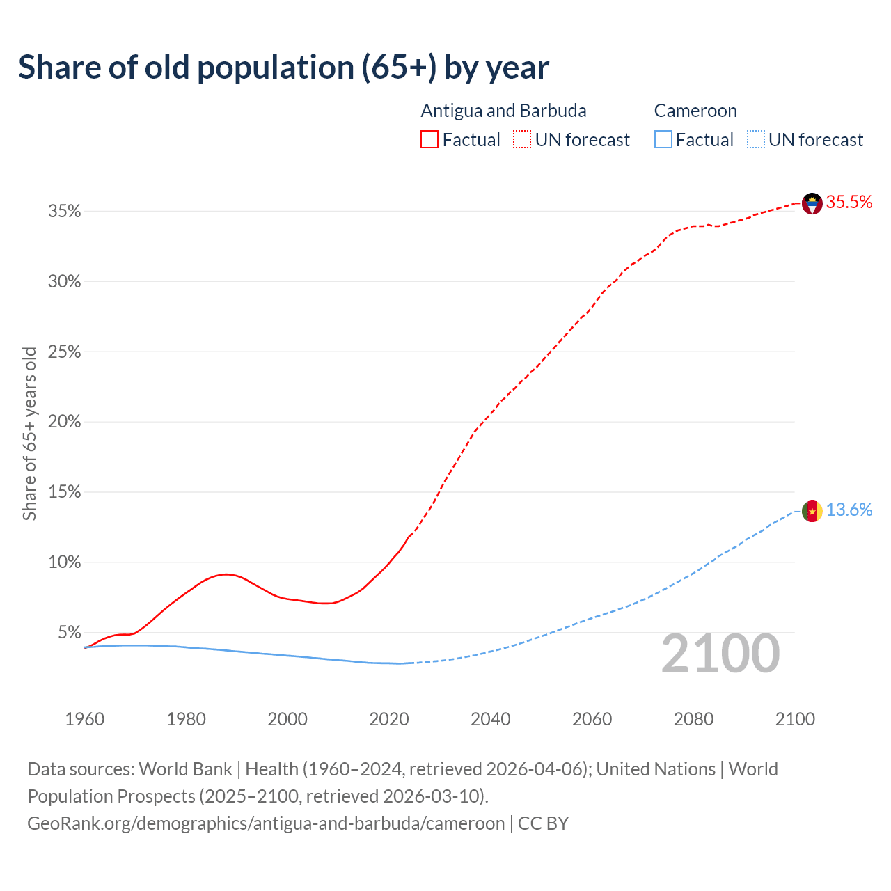 The share of older people aged 65 and over is 11.8% in Antigua and Barbuda and 2.79% in Cameroon. Life expectancy in Antigua and Barbuda compared to Cameroon .