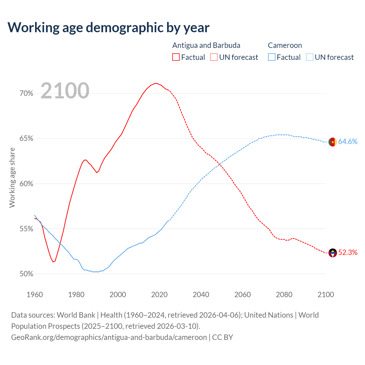 - Antigua and Barbuda has 66.7K working age adults (aged 15-64) vs 17.2M in Cameroon.