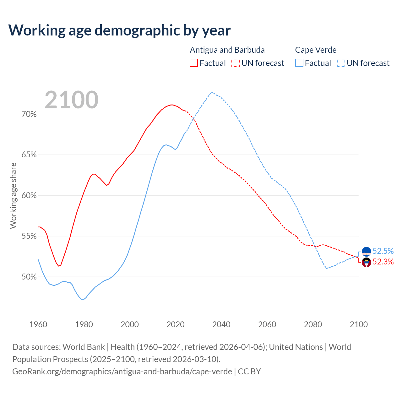 - Antigua and Barbuda has 66.7K working age adults (aged 15-64) vs 359K in Cape Verde.