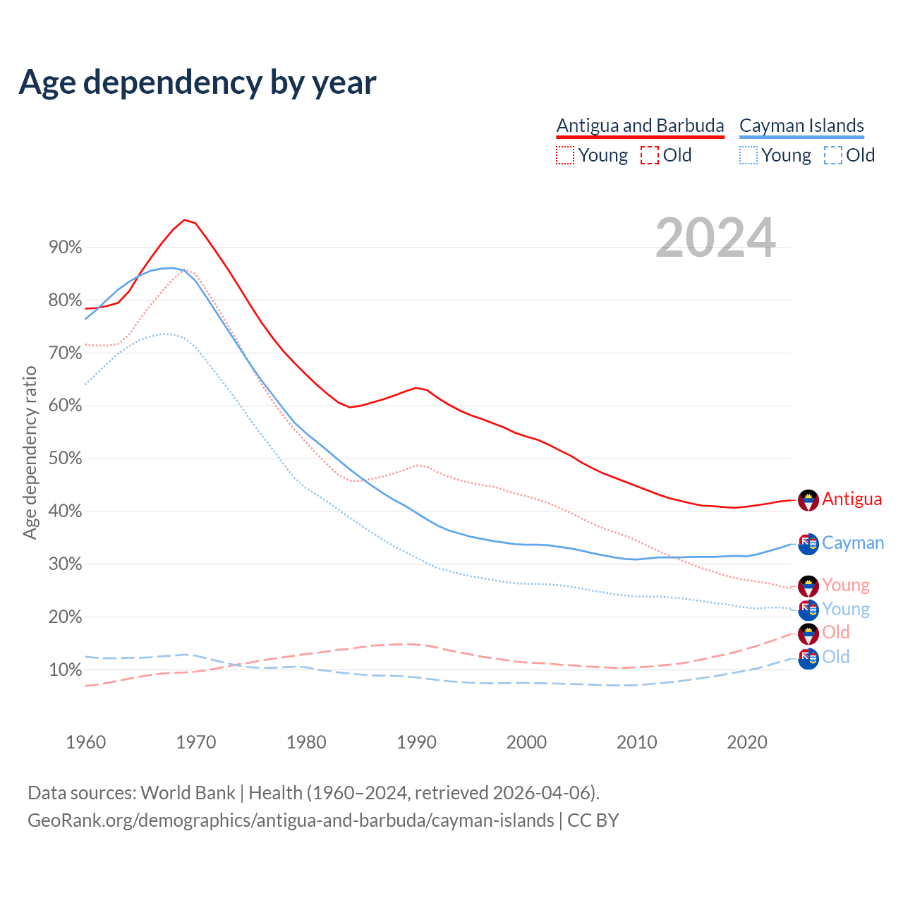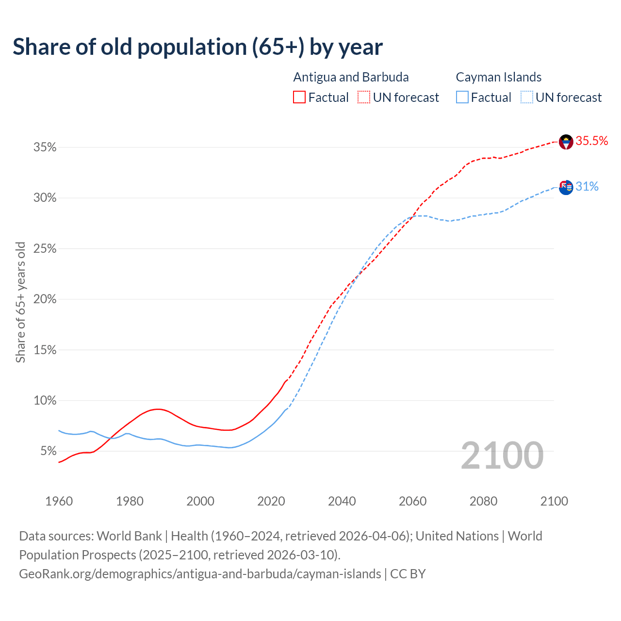 The share of older people aged 65 and over is 11.8% in Antigua and Barbuda and 9% in the Cayman Islands. Life expectancy in Antigua and Barbuda compared to the Cayman Islands .