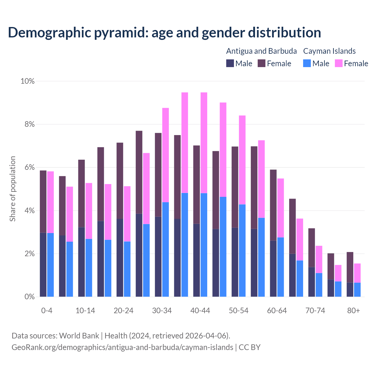 - Antigua and Barbuda is ranked 67/196 by median age (oldest to youngest) vs 51/196 for the Cayman Islands.