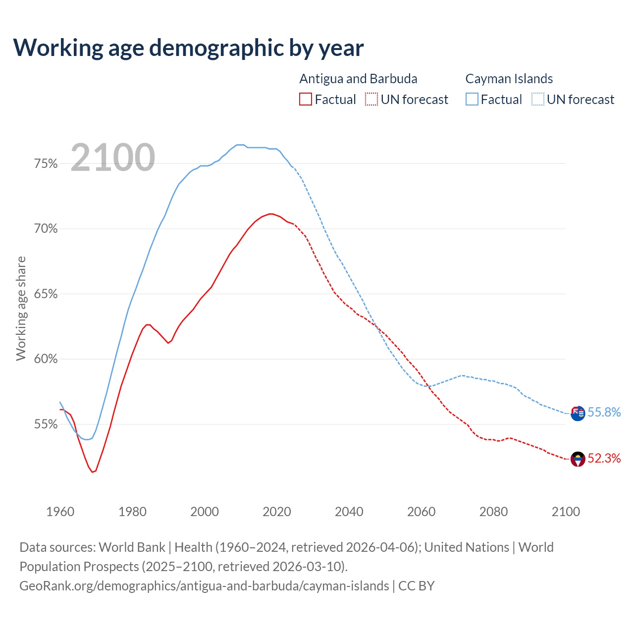 - Antigua and Barbuda has 66.7K working age adults (aged 15-64) vs 58.1K in the Cayman Islands.