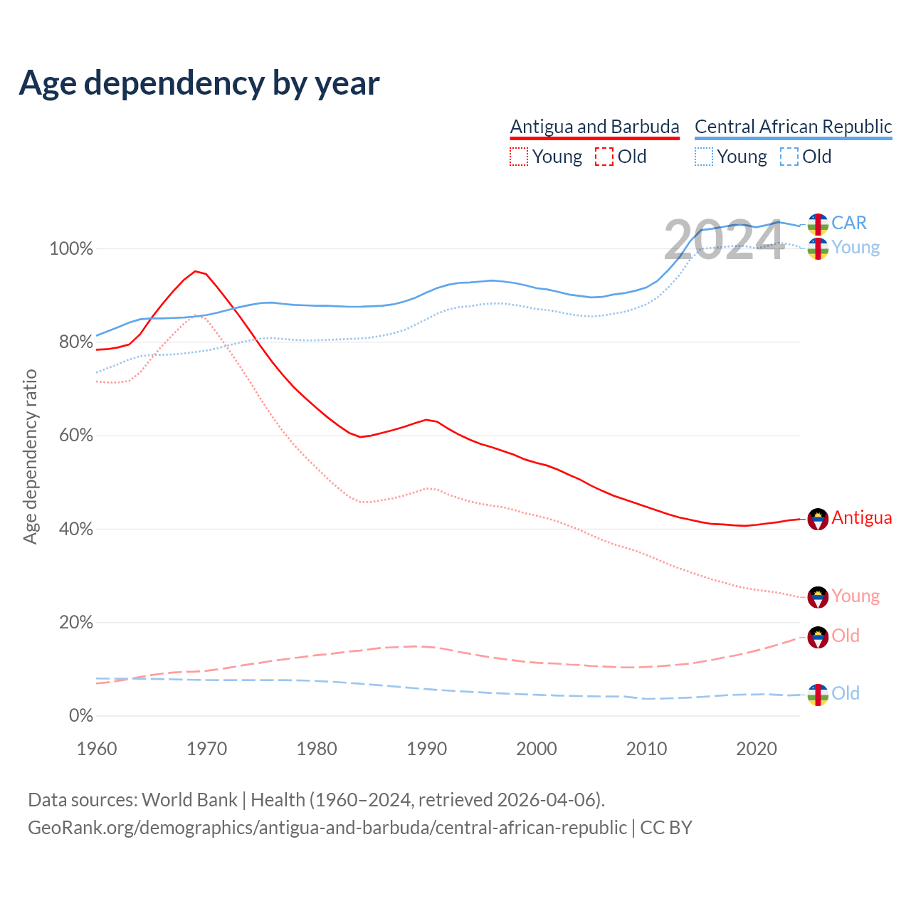 - Antigua and Barbuda is ranked 67/196 by median age (oldest to youngest) vs 196/196 for the Central African Republic.