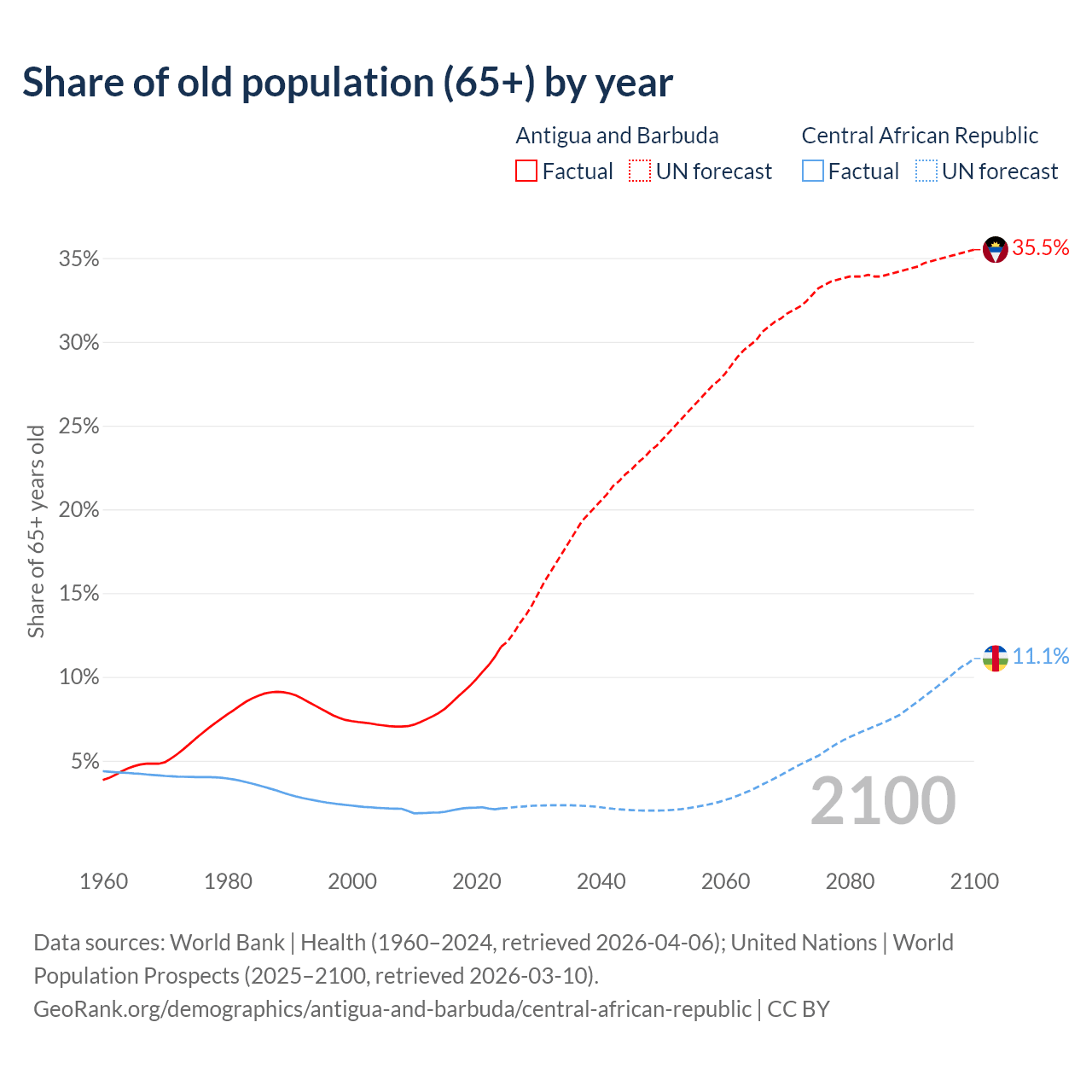 The share of older people aged 65 and over is 11.8% in Antigua and Barbuda and 2.15% in the Central African Republic. Life expectancy in Antigua and Barbuda compared to the Central African Republic .