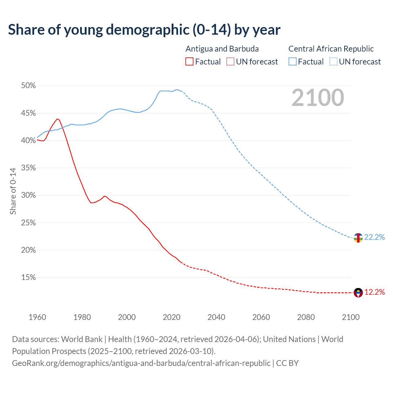 - The share of young demographic (0-15 years old) in Antigua and Barbuda is 17.8% vs 49% in the Central African Republic.