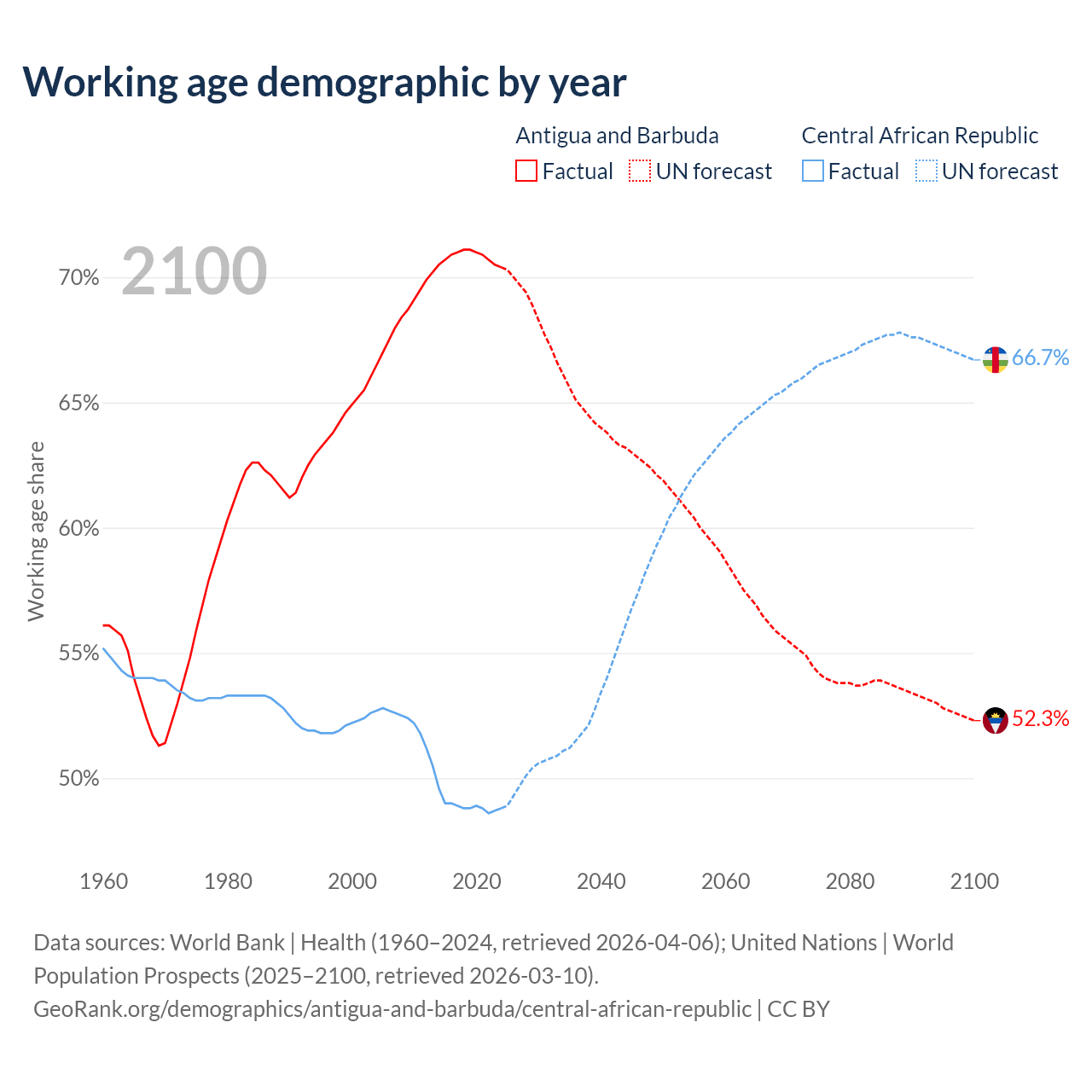 - Antigua and Barbuda has 66.7K working age adults (aged 15-64) vs 2.81M in the Central African Republic.