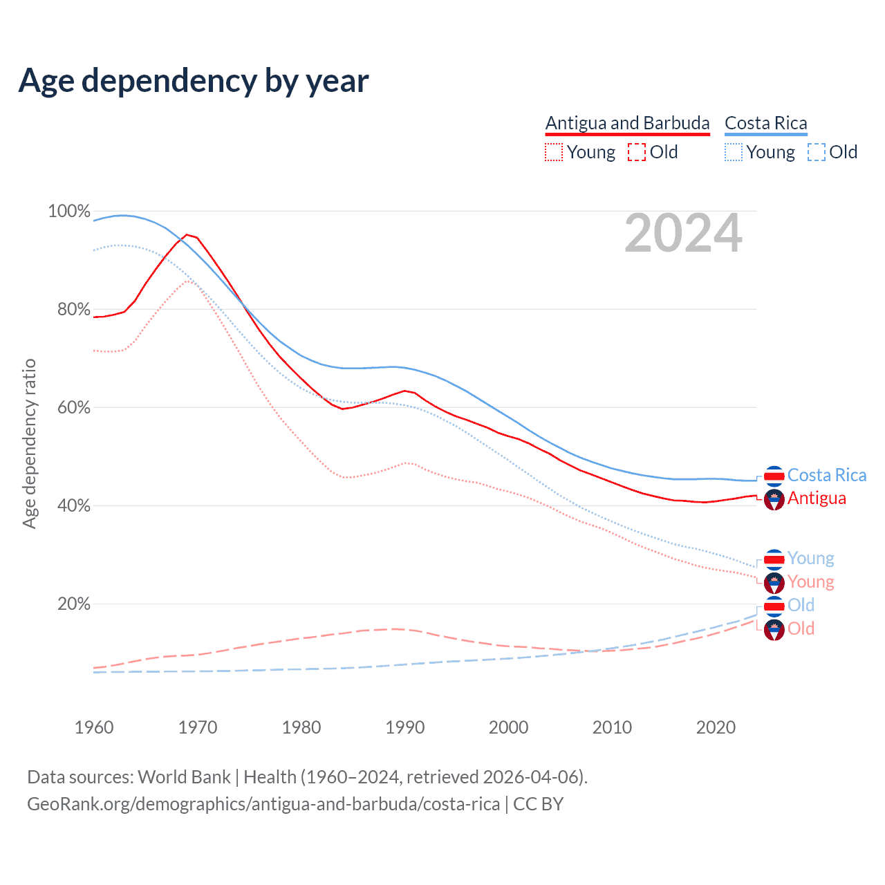 Data sources: World Bank | Health (1960–2024, retrieved 2026-04-06); U.S. Census Bureau (1960–2024, retrieved 2026-02-08).
