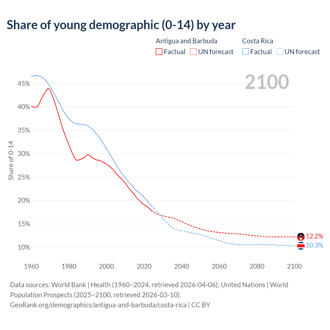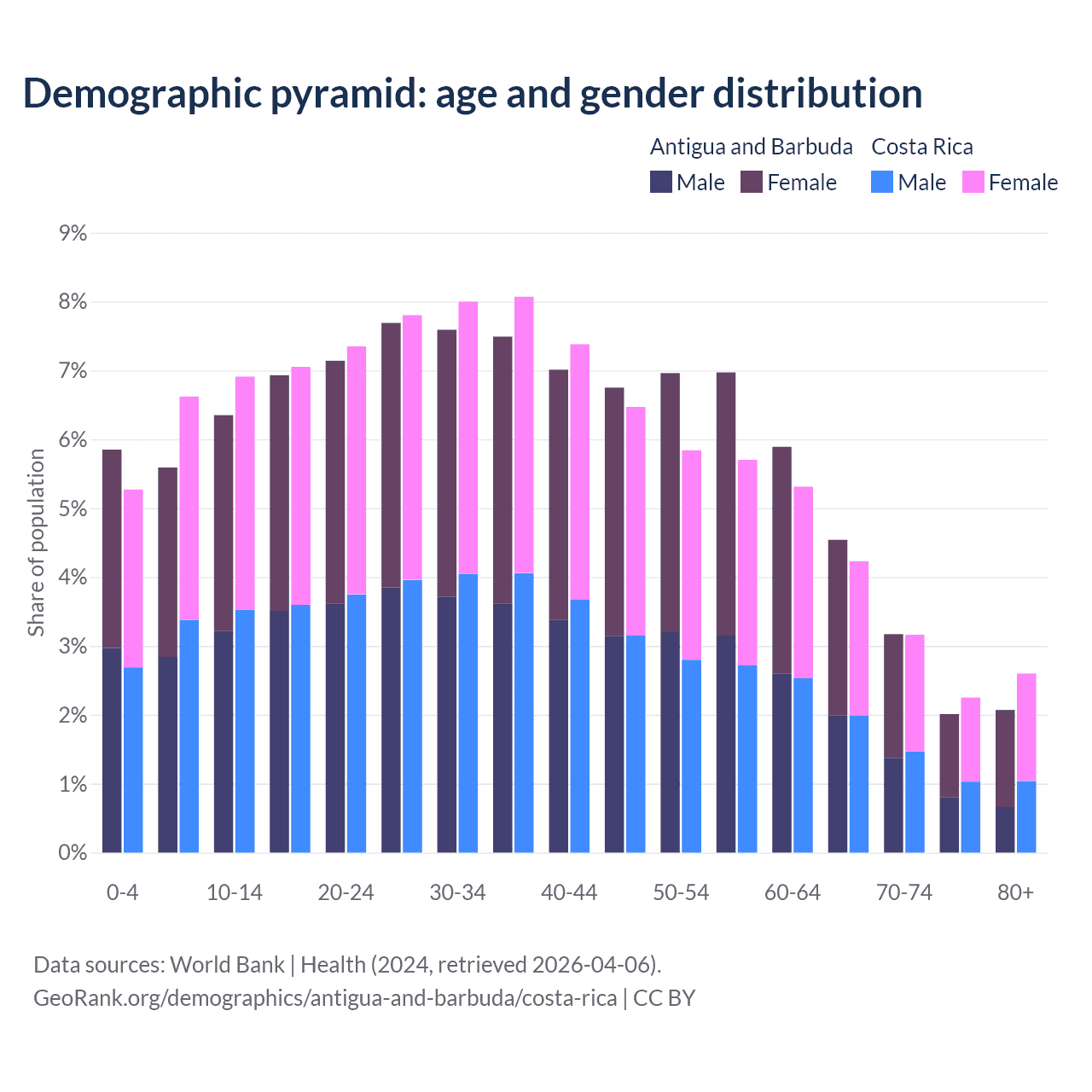 - The share of young demographic (0-15 years old) in Antigua and Barbuda is 17.8% vs 18.8% in Costa Rica.