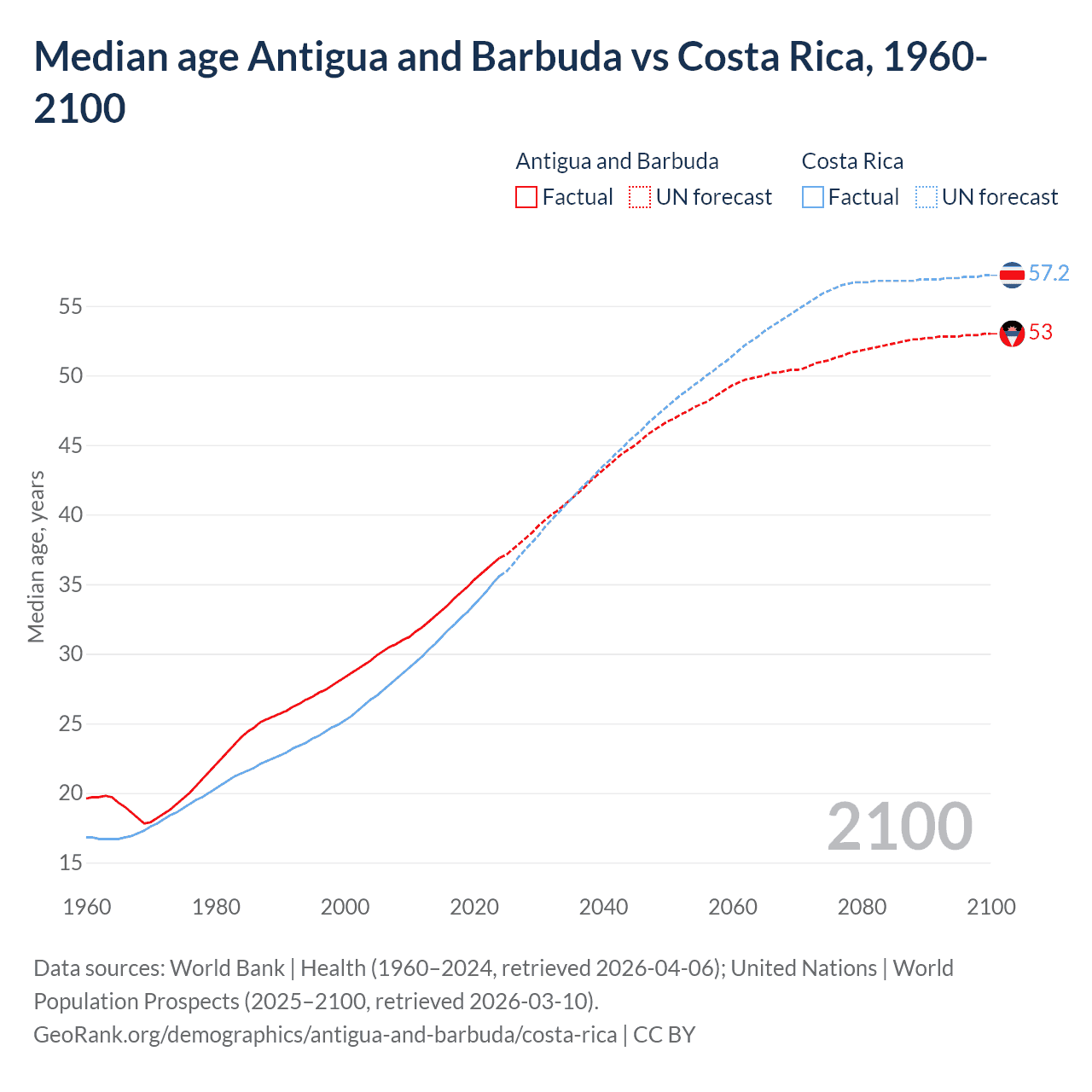 Median age Antigua and Barbuda vs Costa Rica, 1960-2100
