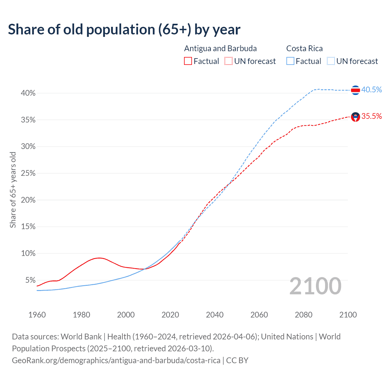 The share of older people aged 65 and over is 11.8% in Antigua and Barbuda and 12.2% in Costa Rica. Life expectancy in Antigua and Barbuda compared to Costa Rica .