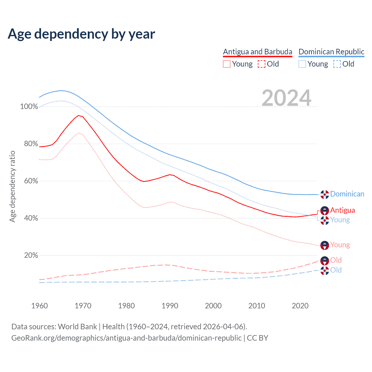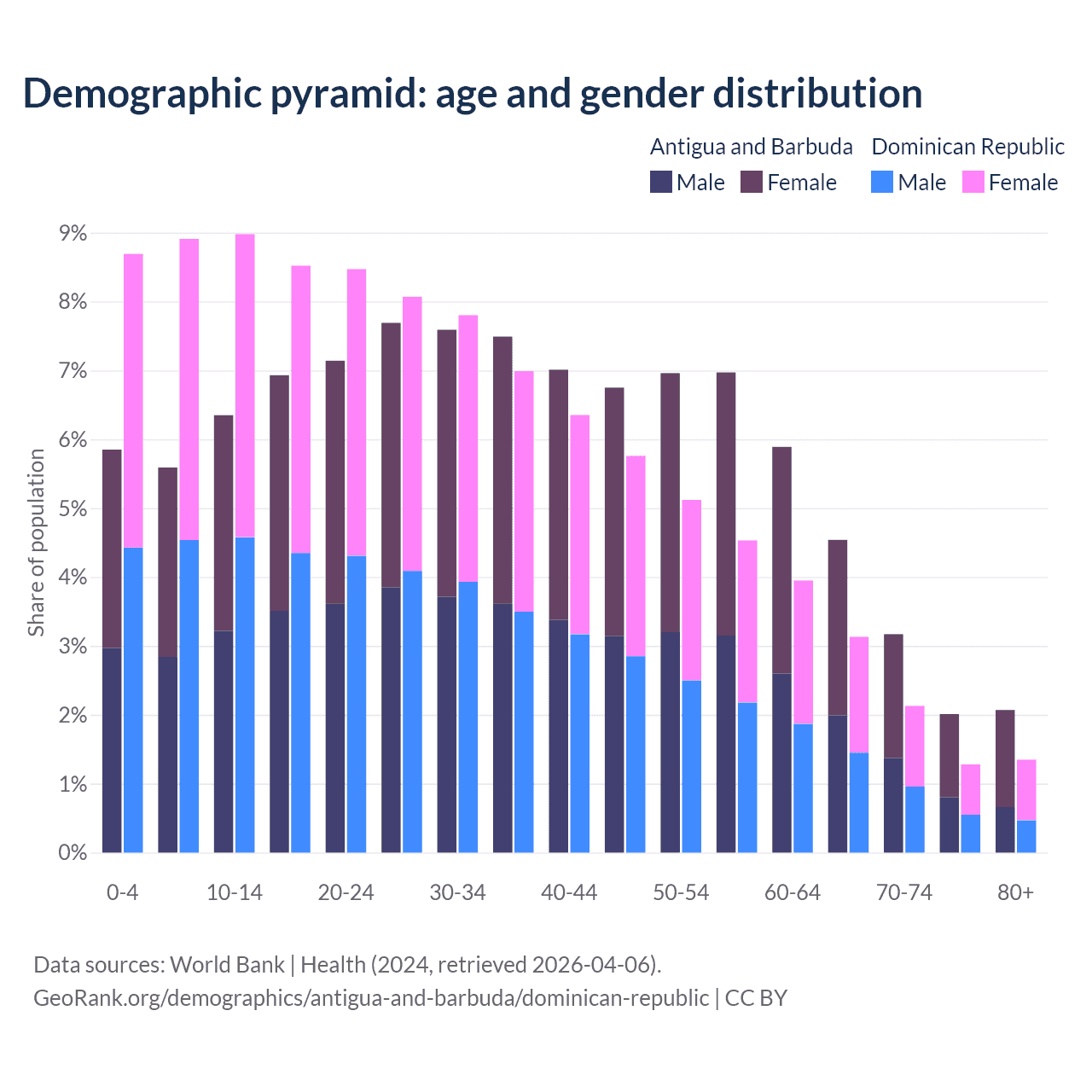 - Antigua and Barbuda is ranked 67/196 by median age (oldest to youngest) vs 112/196 for the Dominican Republic.