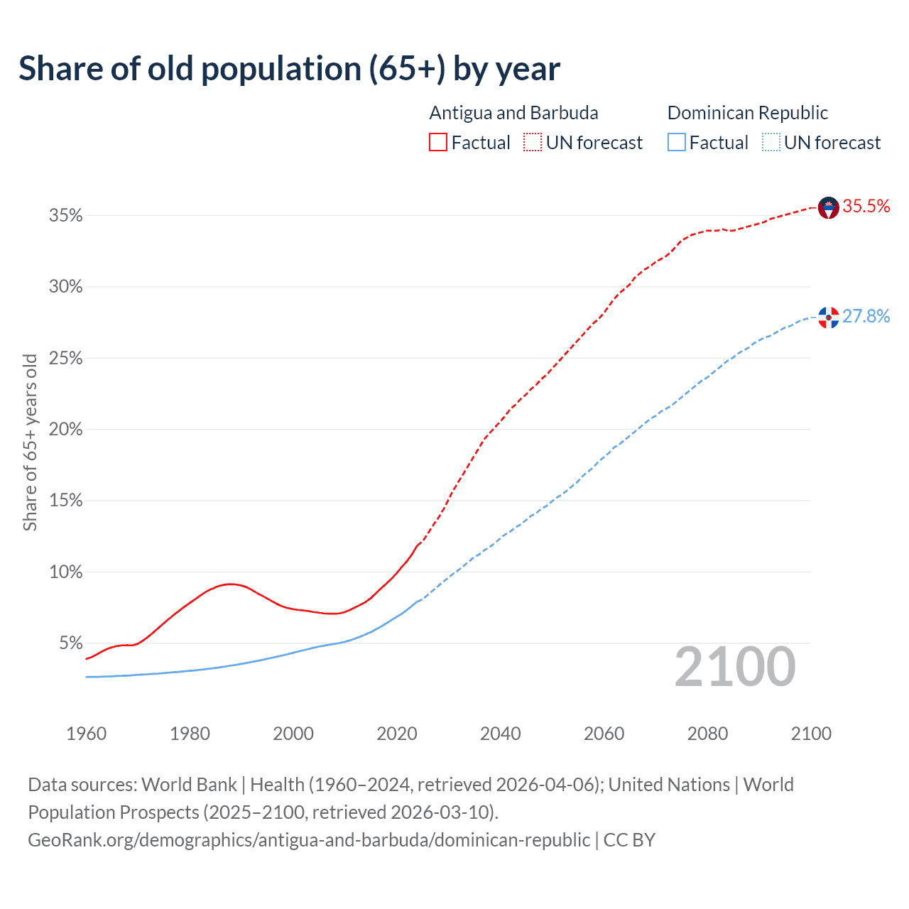 The share of older people aged 65 and over is 11.8% in Antigua and Barbuda and 7.88% in the Dominican Republic. Life expectancy in Antigua and Barbuda compared to the Dominican Republic .