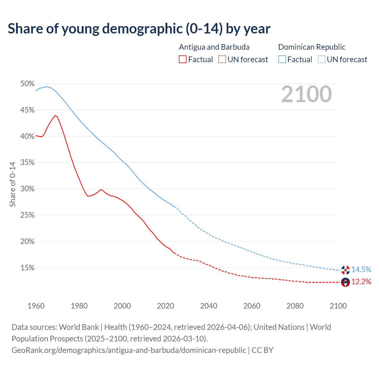 - The share of young demographic (0-15 years old) in Antigua and Barbuda is 17.8% vs 26.6% in the Dominican Republic.