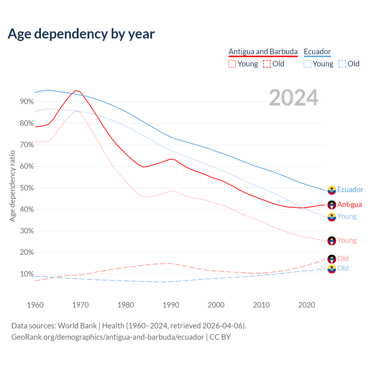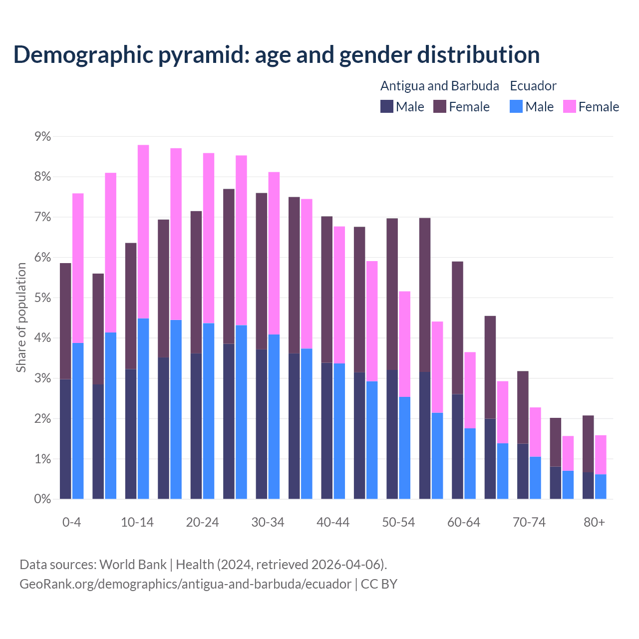- Antigua and Barbuda is ranked 67/196 by median age (oldest to youngest) vs 105/196 for Ecuador.