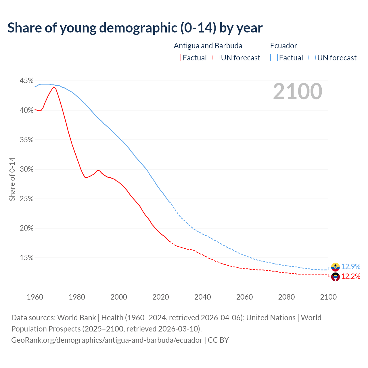 - The share of young demographic (0-15 years old) in Antigua and Barbuda is 17.8% vs 24.5% in Ecuador.