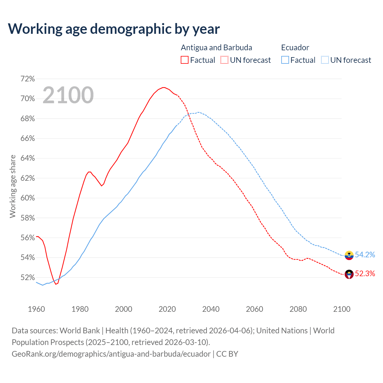 - Antigua and Barbuda has 66.7K working age adults (aged 15-64) vs 12.4M in Ecuador.