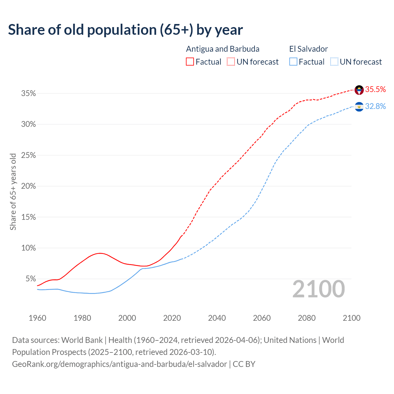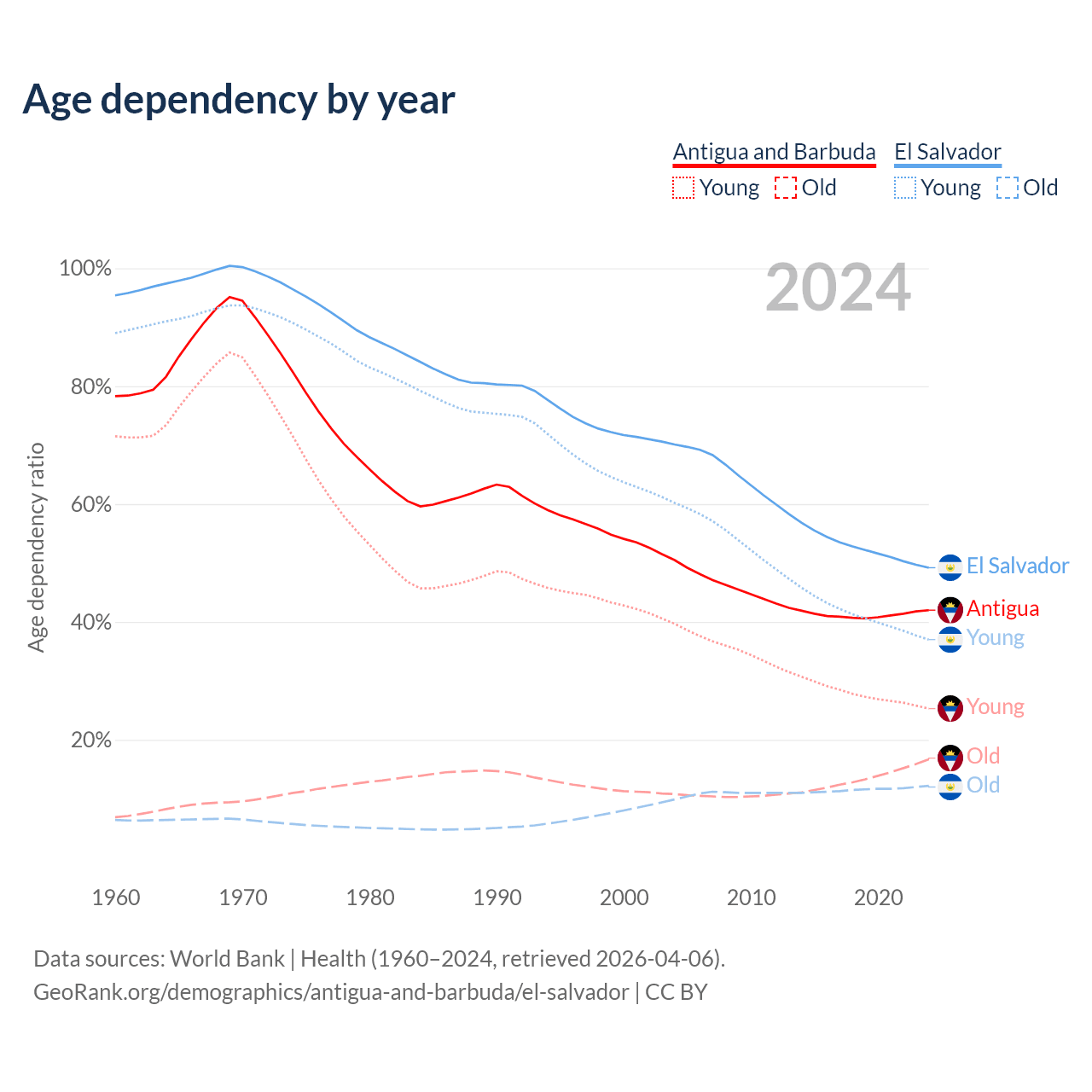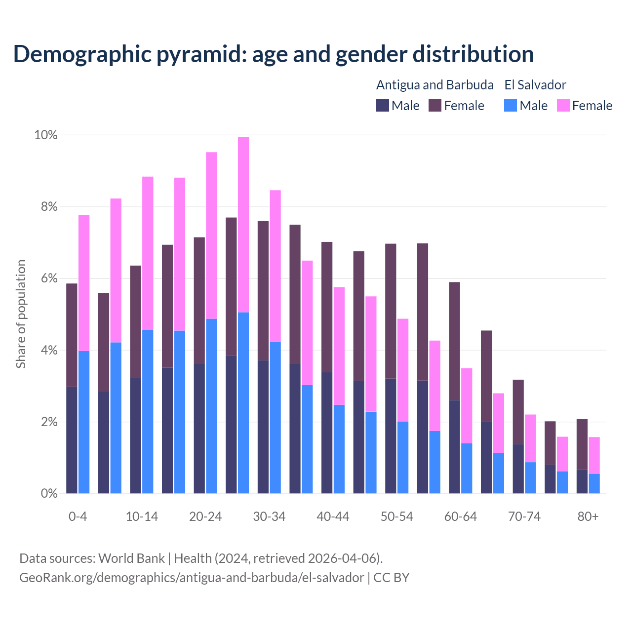 - Antigua and Barbuda is ranked 67/196 by median age (oldest to youngest) vs 115/196 for El Salvador.