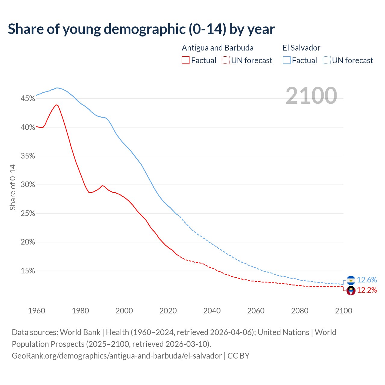 - The share of young demographic (0-15 years old) in Antigua and Barbuda is 17.8% vs 24.8% in El Salvador.