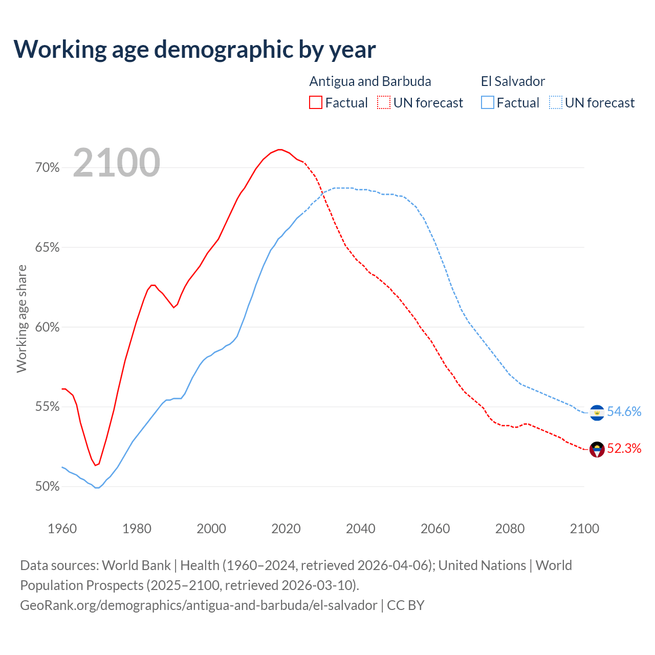 - Antigua and Barbuda has 66.7K working age adults (aged 15-64) vs 4.29M in El Salvador.