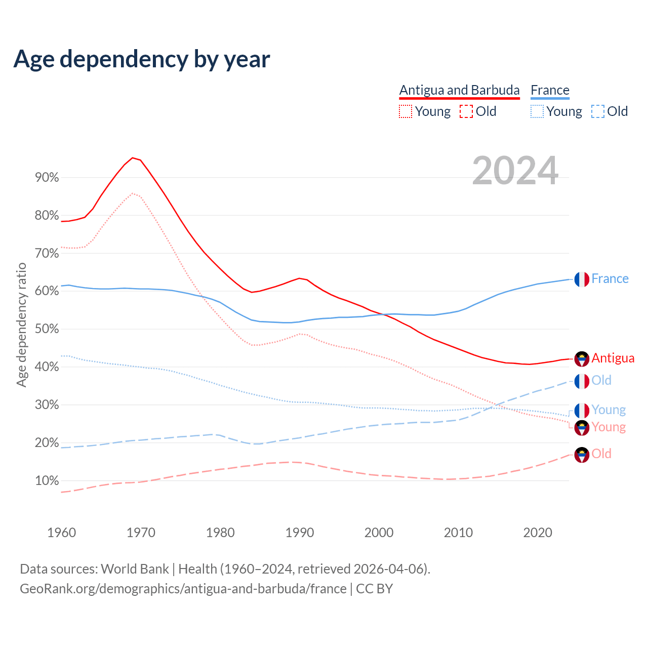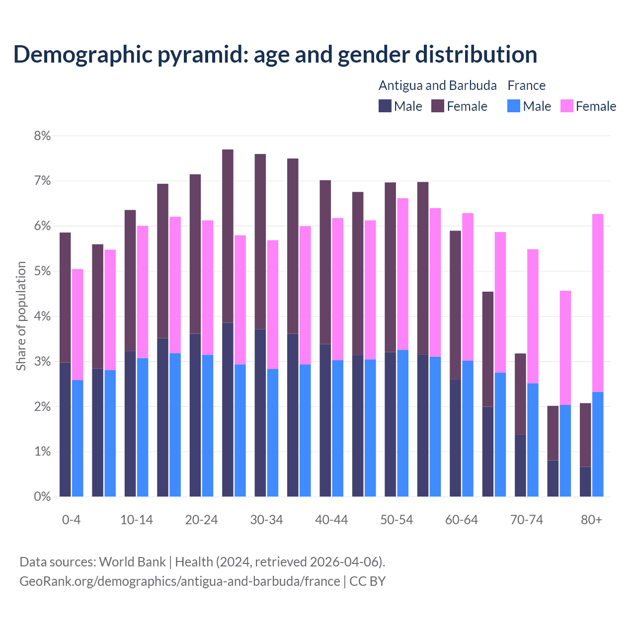 - Antigua and Barbuda is ranked 67/196 by median age (oldest to youngest) vs 29/196 for France.