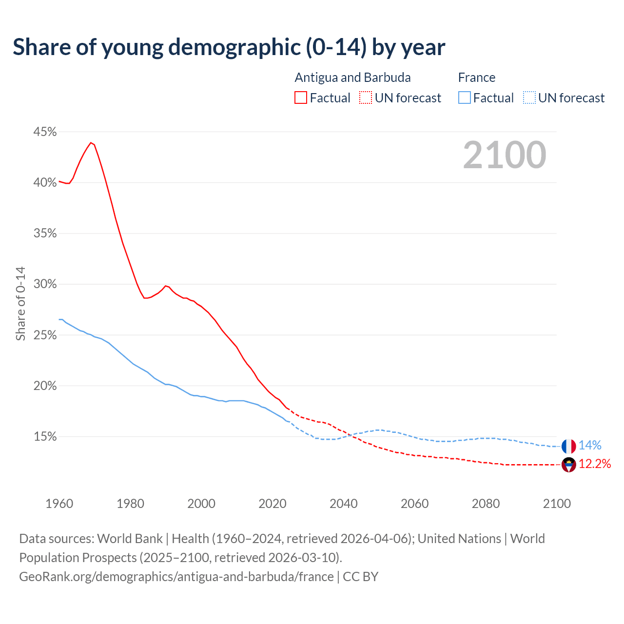 - The share of young demographic (0-15 years old) in Antigua and Barbuda is 17.8% vs 16.5% in France.