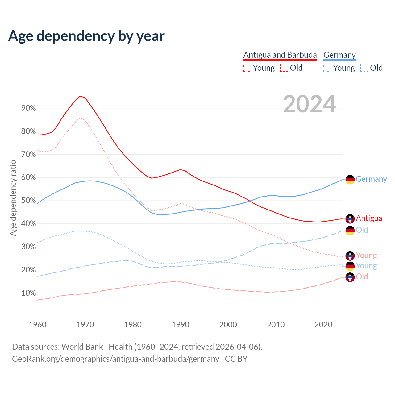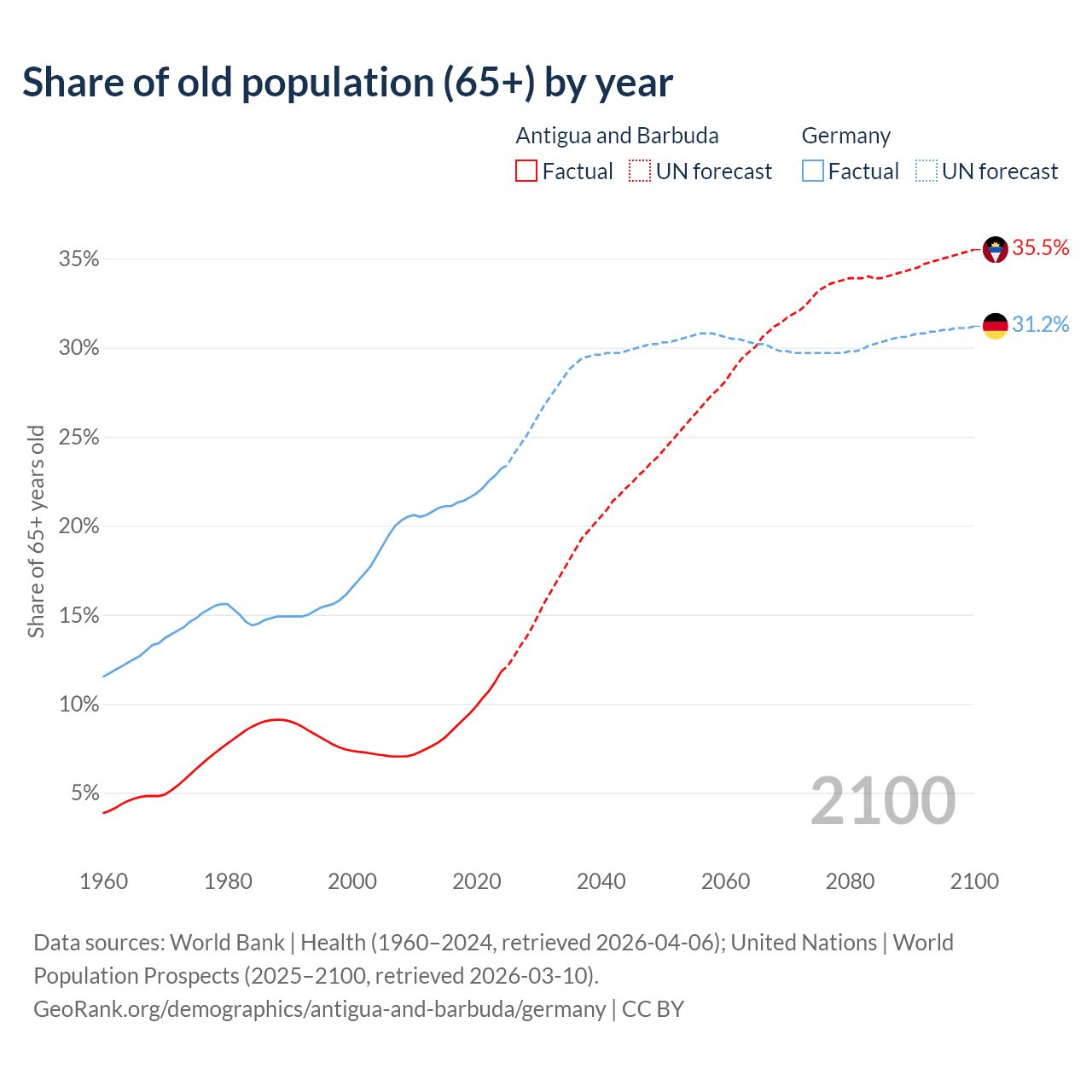 The share of older people aged 65 and over is 11.8% in Antigua and Barbuda and 23.2% in Germany. Life expectancy in Antigua and Barbuda compared to Germany .