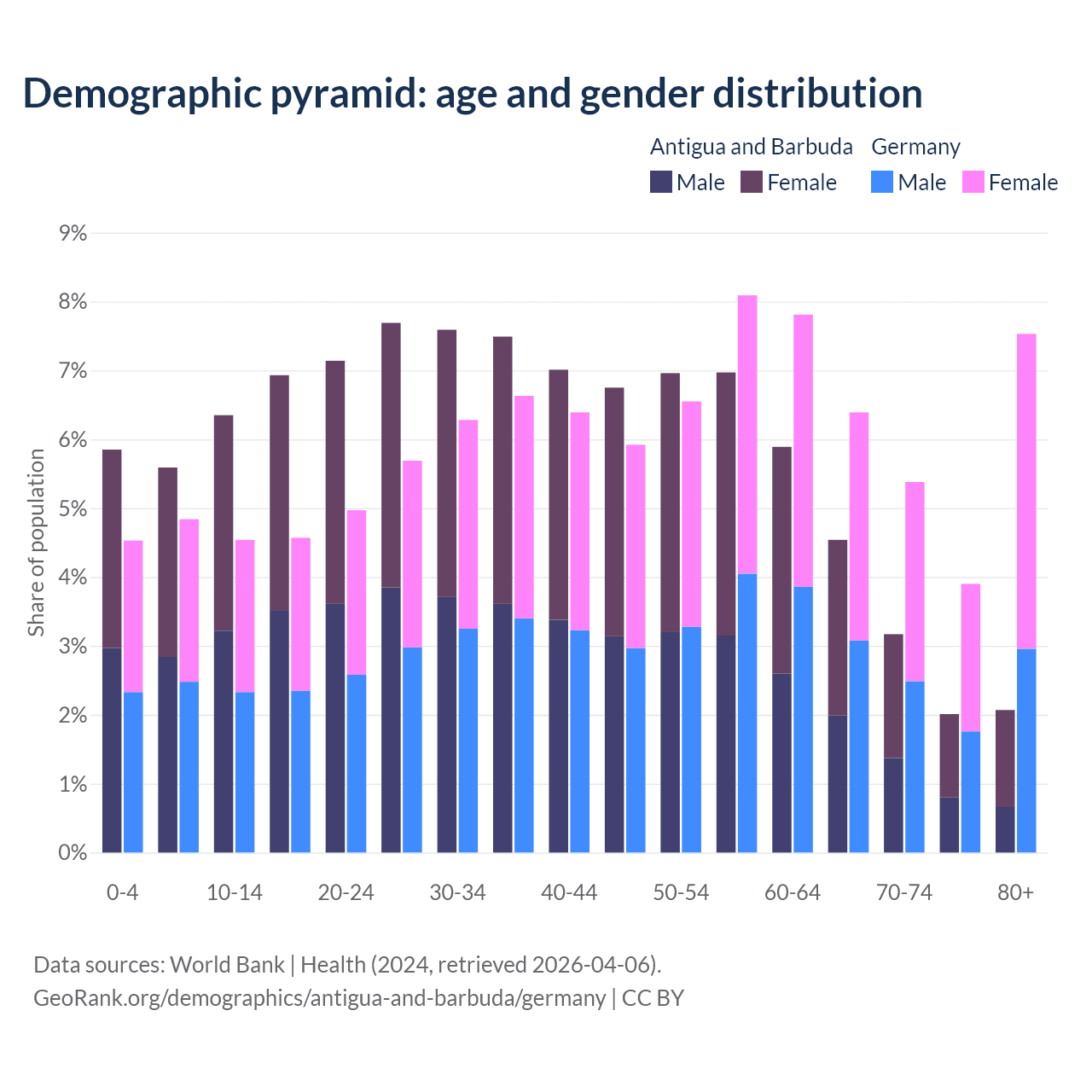 - Antigua and Barbuda is ranked 67/196 by median age (oldest to youngest) vs 9/196 for Germany.
