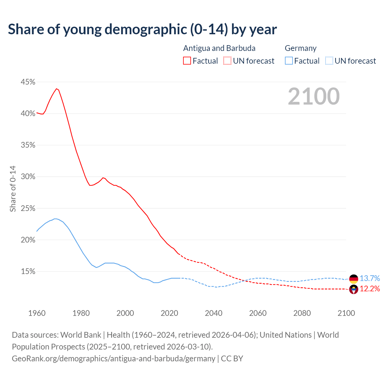 - The share of young demographic (0-15 years old) in Antigua and Barbuda is 17.8% vs 13.9% in Germany.