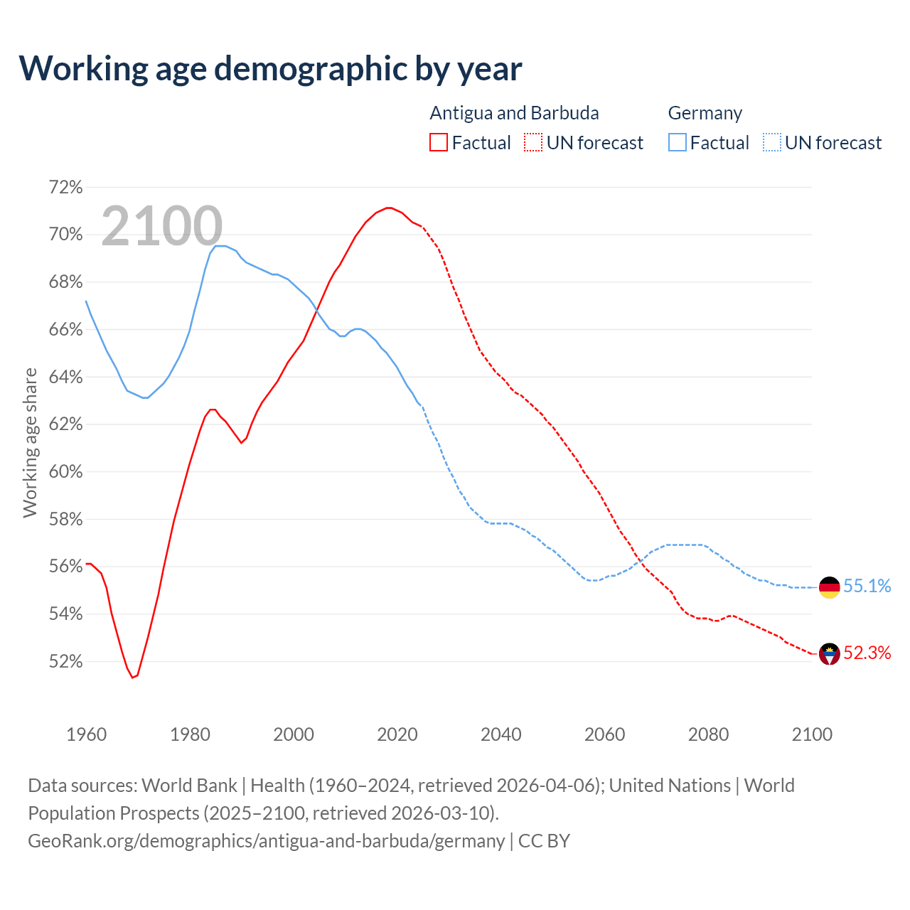 - Antigua and Barbuda has 66.7K working age adults (aged 15-64) vs 51.9M in Germany.