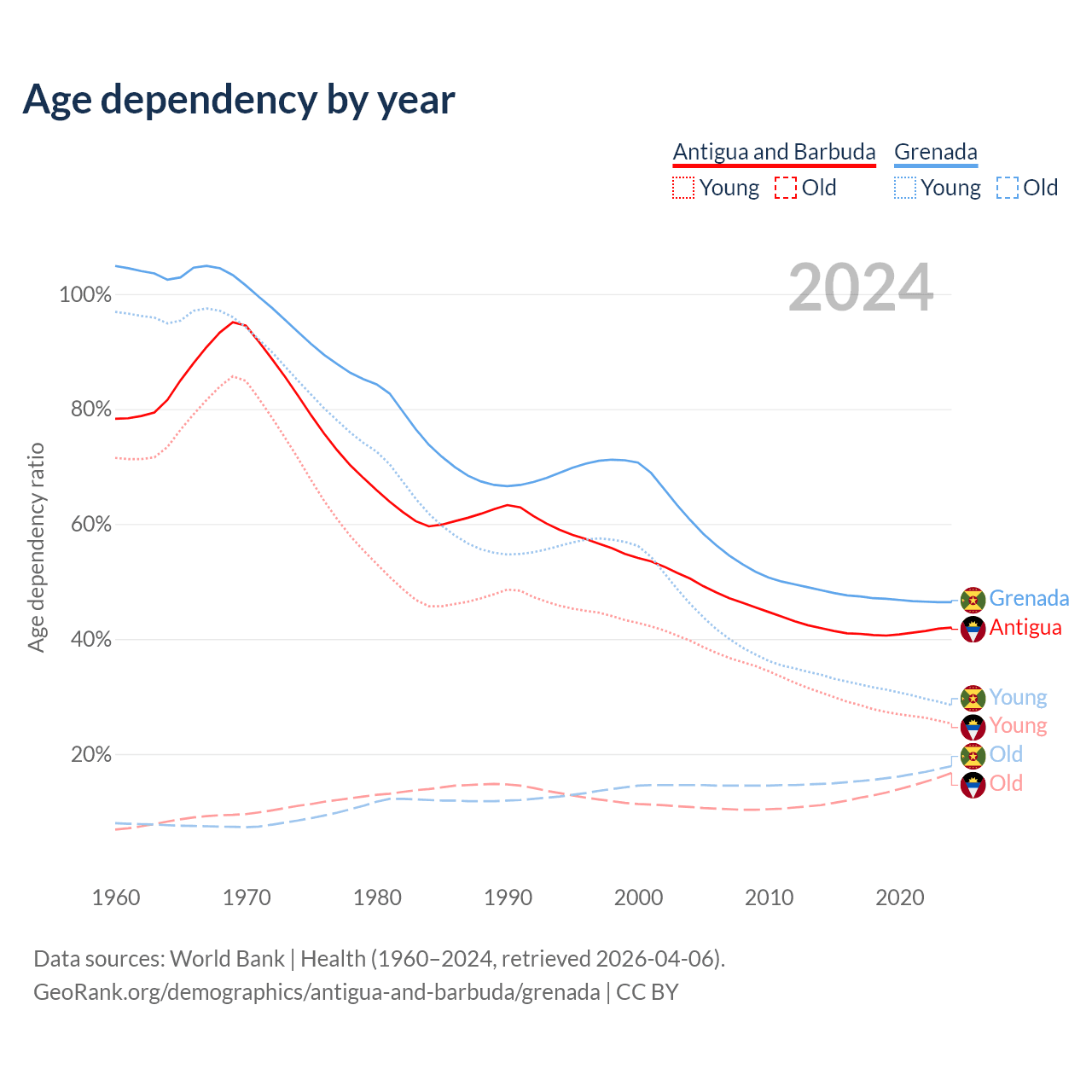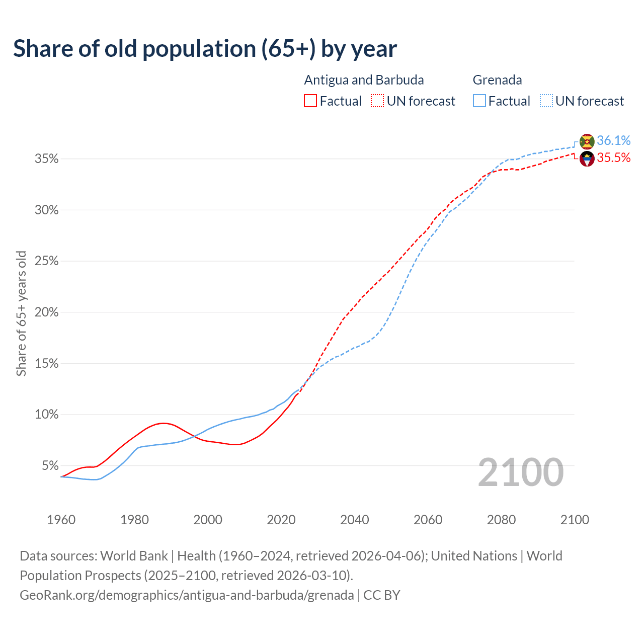 The share of older people aged 65 and over is 11.8% in Antigua and Barbuda and 12.2% in Grenada. Life expectancy in Antigua and Barbuda compared to Grenada .